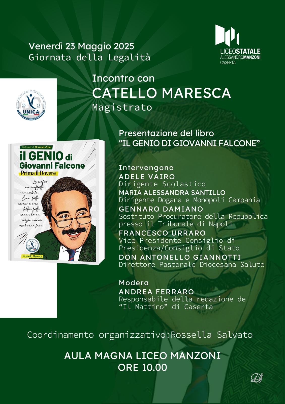 La Mafia non è affatto invincibile , parte da questa frase di Giovanni Falcone per presentarsi ai ragazzi e parlare del suo nuovo libro . , Il genio di Giovanni Falcone . Prima il dovere ,il dott Catello Maresca , Magistrato, il cui impegno civile nella lotta contro ogni forma di criminalità organizzata si realizza nella tenace conservazione del ricordo dei due giudici simbolo del contrasto alla mafia, Giovanni Falcone e Paolo Borsellino.