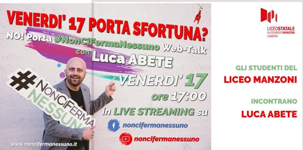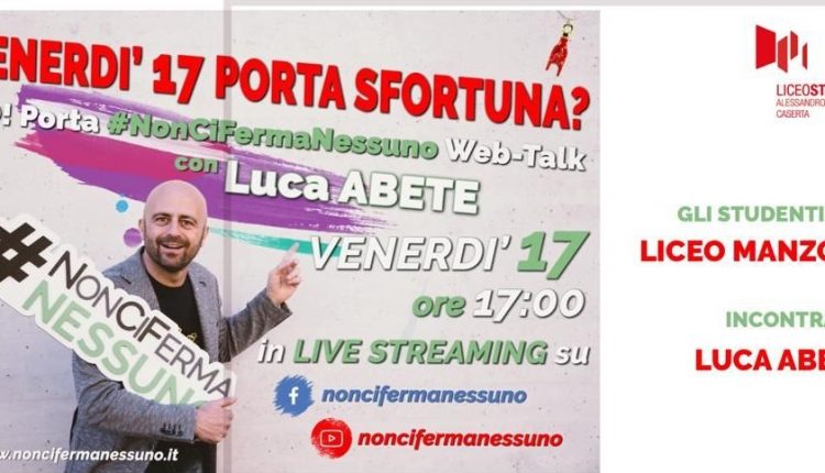 CASERTA – Gli studenti del liceo Manzoni di Caserta incontrano Luca Abete per il suo #noncifermanessuno web-talk. Saranno oltre duecento gli studenti che parteciperanno online in diretta streaming ad un confronto con il volto noto di Striscia la Notizia: l’intero comitato studentesco in rappresentanza delle 90 classi del liceo, le avanguardie del progetto legalità di cui il liceo Manzoni guidato dalla Dirigente Adele Vairo è capofila nazionale con la Fondazione Falcone con cui progetta e lavora da quasi dieci anni, e tanti altri studenti selezionati per interesse e motivazione.