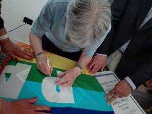 A Suor Rita infine, prima di congedarsi, le è stato chiesto di apporre la sua firma sulla preziosa “Bandiera della Pace” dove già è presente la firma di Mons. Nogaro, da lui posta anni fa. Si tratta della Bandiera che il Movimento per la Pace custodisce come un tesoro, e dove da questa data spiccano le firme di due grandi Testimoni di Pace e di accoglienza della nostra terra. Grazie Suon Rita per il dono dell’umanità per essere la Madre di tutti gli ultimi. Grazie padre vescovo Raffaele per il dono della Pace e per aver incarnato il messaggio vivente del Vangelo di Cristo, ovvero quello del Servizio con il grembiule!”.