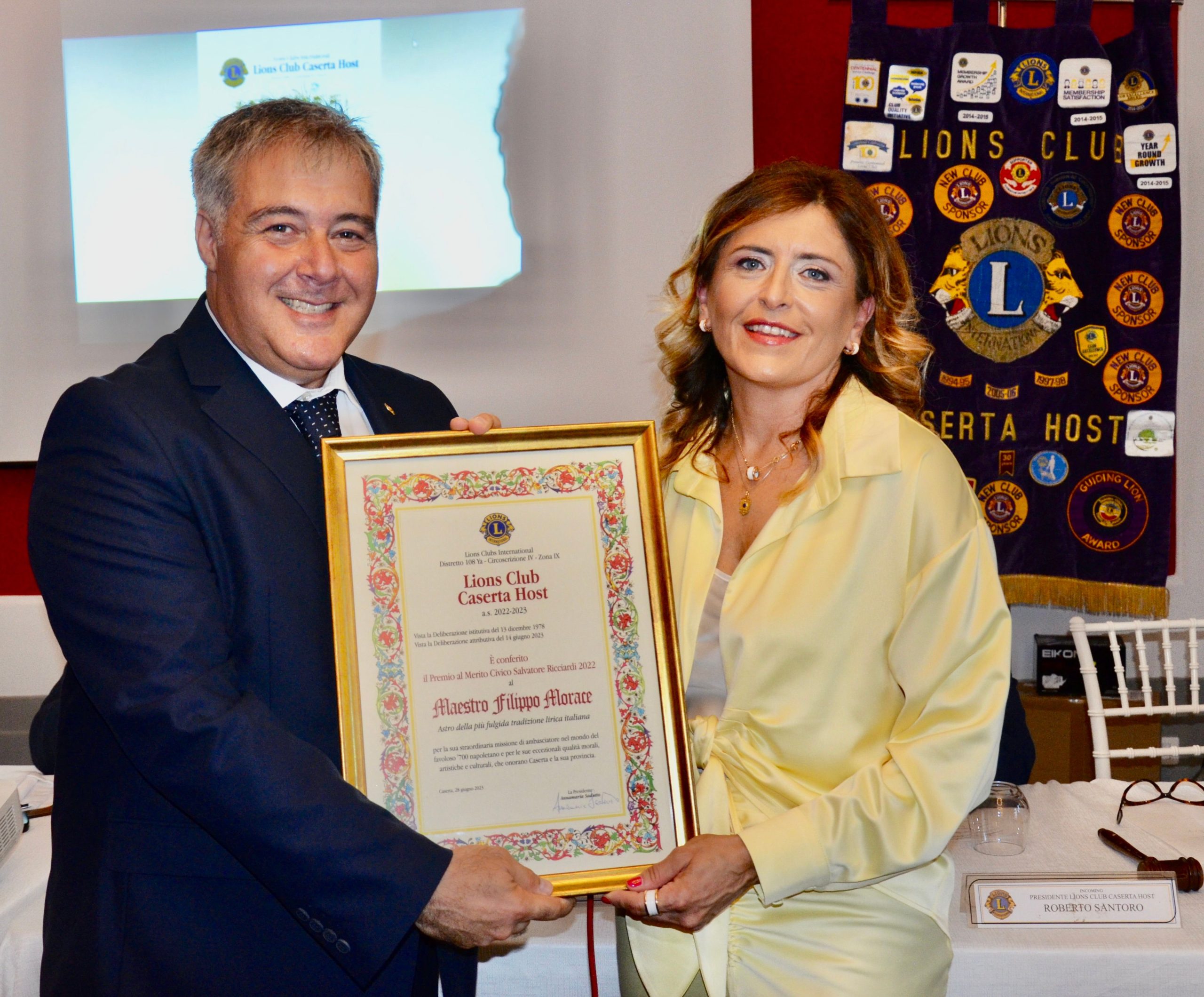 Prima della ritualità conclusiva dell’anno sociale – presenti il Delegato del Governatore Alberto Zaza d’Aulisio, l’officer distrettuale Gianfranco Ucci, i presidenti di circoscrizione, Giuseppe Casapulla, e di zona Michele Pio – bino – sono stati consegnati al Basso-baritono Filippo Morace il Premio al Merito Civico Salvatore Ricciardi, giunto alla 40esima edizione, in riconoscimento della sua straordinaria missione di ambasciatore nel mondo del favoloso ‘700 napoletano , ed il premio Grandi Risultati a Sofia Equitani della scuola media Giannone-De Amicis di Caserta ed alla preside Maria Bianco per la selezione dell’elaborato grafico policromo che parteciperà al concorso annuale “Poster della pace” bandito dal Lions multidistrettuale d’Italia. L’orgoglio della Dirigente Scolastica per la brillante performance della allieva del prestigioso Istituto di istruzione secondaria di primo grado di Caserta; la visibile felicità della giovane studentessa per l’apprezzamento riscosso dalla sua opera; la emozione del maestro Morace nel ricordo sempre vivo della prima edizione del Premio al Merito Civico nel 1979. ” Avevo otto anni. Accompagnai mio padre ad una cerimonia alla quale teneva particolarmente. Rivedo la bella manifestazione che si svolse nel salone dei convegni dell’Orfanotrofio Sant’Antonio al corso Giannone. Il fondatore-direttore monsignor Mario Vallarelli era l’insignito. Il suo sorriso radioso disse tanto, più delle parole. Da qui considero il grande onore che il Lions Caserta Host ha inteso conferirmi”.