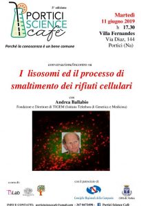 A Villa Fernandes( bene confiscato alla camorra ) in via Diaz, 144 a Portici (Na), eccezionalmente martedì 11 giugno 2019, con inizio alle ore 17.30, il Portici Science Cafè conclude l’ultimo appuntamento del V ciclo. Del “Portici Science Cafè”. L’incontro, dal titolo “I lisosomi ed il processo di smaltimento dei rifiuti cellulari”, avrà come ospite il professore Andrea BALLABIO, Fondatore e Direttore dell’Istituto Telethon di Genetica e Medicina (TIGEM) e sarà moderato dal giornalista Romualdo GIANOLI.