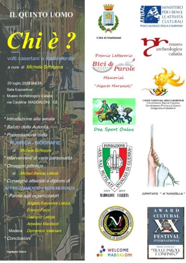 Sabato, 20 luglio 2019, nella Sala Espositiva del Museo Archeologico Nazionale Calatia di Maddaloni con sede in via Caudina, dalle ore 18 alle ore 20, si terrà l’evento “Il quinto uomo – Chi è?- volti casertani e maddalonesi a cura di Michele Schioppa”. La manifestazione è promossa e patrocinata da: Polo Museale della Campania (Ministero per i Beni e le Attività Culturali); Museo Archeologico Nazionale Calatia; Comune di Maddaloni; U.N.A.C. delegazione di Maddaloni, Coordinamento provinciale di Caserta e coordinamento Regione Campania; Premio Letterario “Bici & Parole” Memorial Alberto Marzaioli; Dea Sport Onlus di Bellona, editrice della rivista Dea Notizie e della collana “Chi è?”; A.N.M.I.G. e Fondazione provinciale di Caserta; Comitato Associazione Interforze “Giordano Bruno” di Maddaloni; Comitato di Associazioni “A’ Funicella”; Welcome Maddaloni; Award Cultural Festival International.