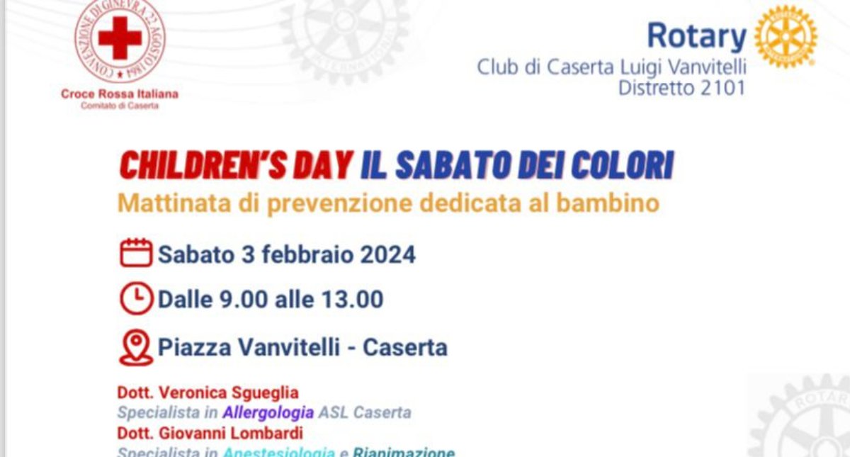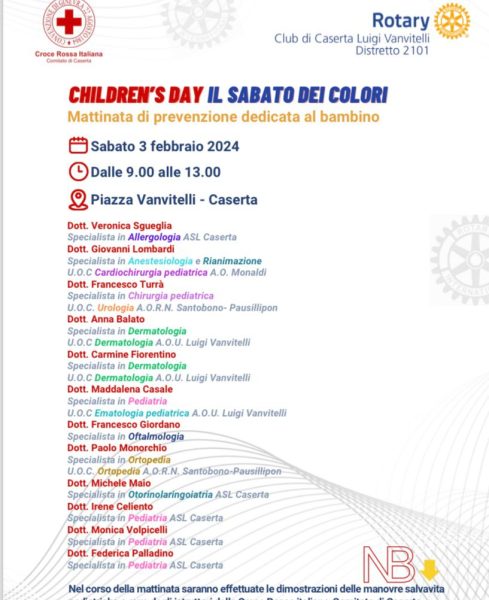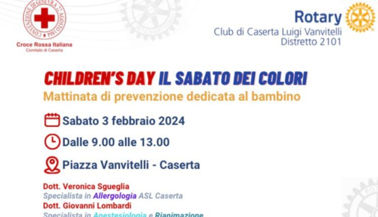 Si chiama “Children’s Day. Il sabato dei colori”, è il nome del lodevole service di solidarietà e prevenzione promosso dal Rotary Club Caserta Luigi Vanvitelli, di cui è presidente Gianluca Parente, in collaborazione con il Comitato di Caserta della Croce Rossa Italiana, di cui è responsabile Teresa Natale, che avrà luogo il prossimo 3 febbraio 2024, nella centralissima Piazza Vanvitelli a Caserta.
