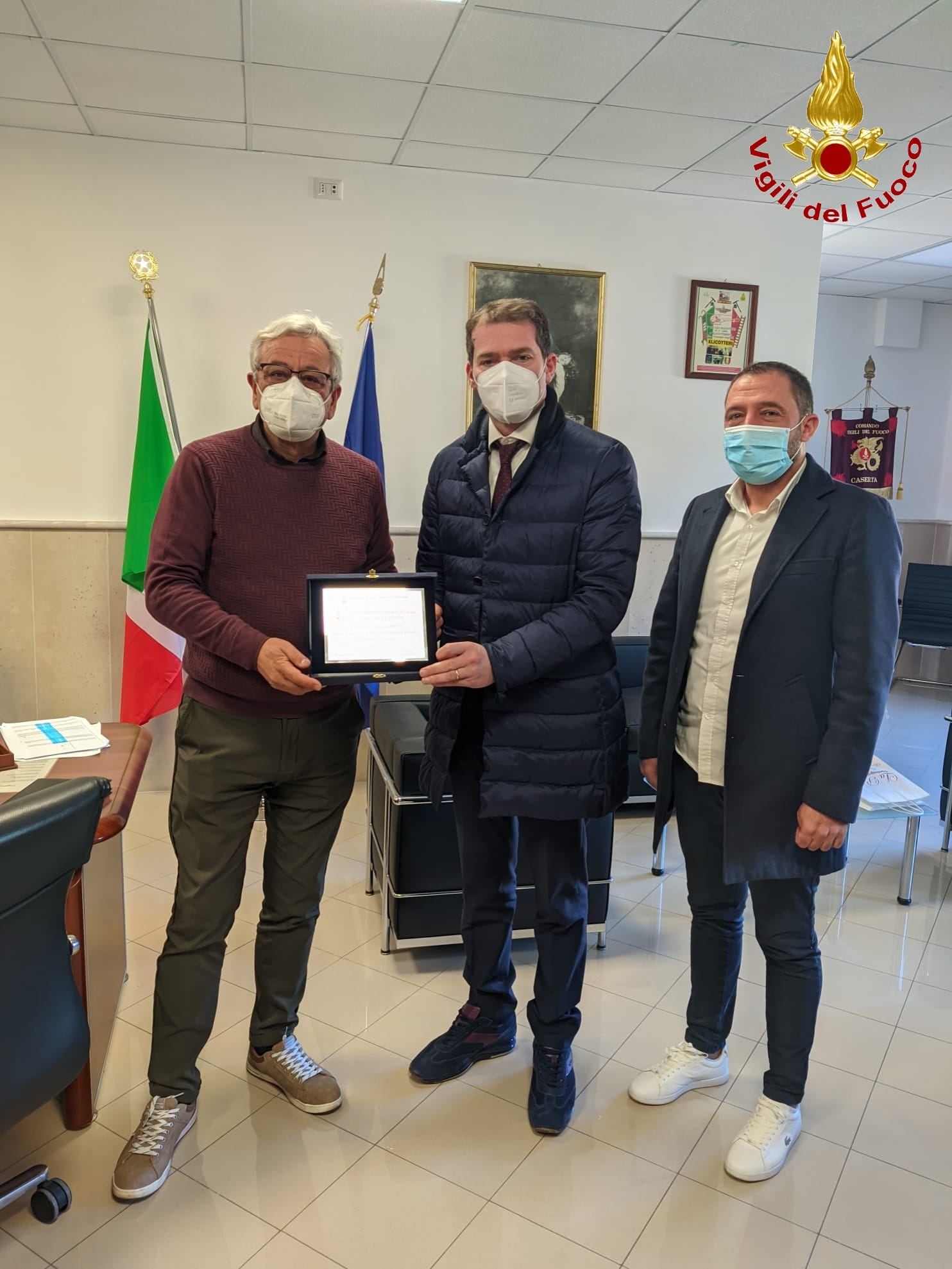 Il sindaco consegna una targa di ringraziamento ai Vigili del Fuoco