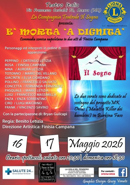 Cultura, tradizione e impegno sociale per due serate di solidarietà. L’appuntamento è per i giorni sabato 16 alle ore 20.30 e domenica 17 maggio alle ore 18.30 al teatro Italia per lo spettacolo E’ Morta ’A Dignità, vivace commedia in due atti scritta da Finisia Campana e portata in scena dalla Compagnia Teatrale Il Sogno, realtà ormai consolidata nel panorama artistico locale.