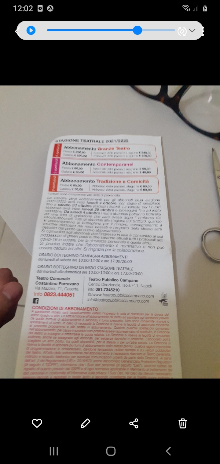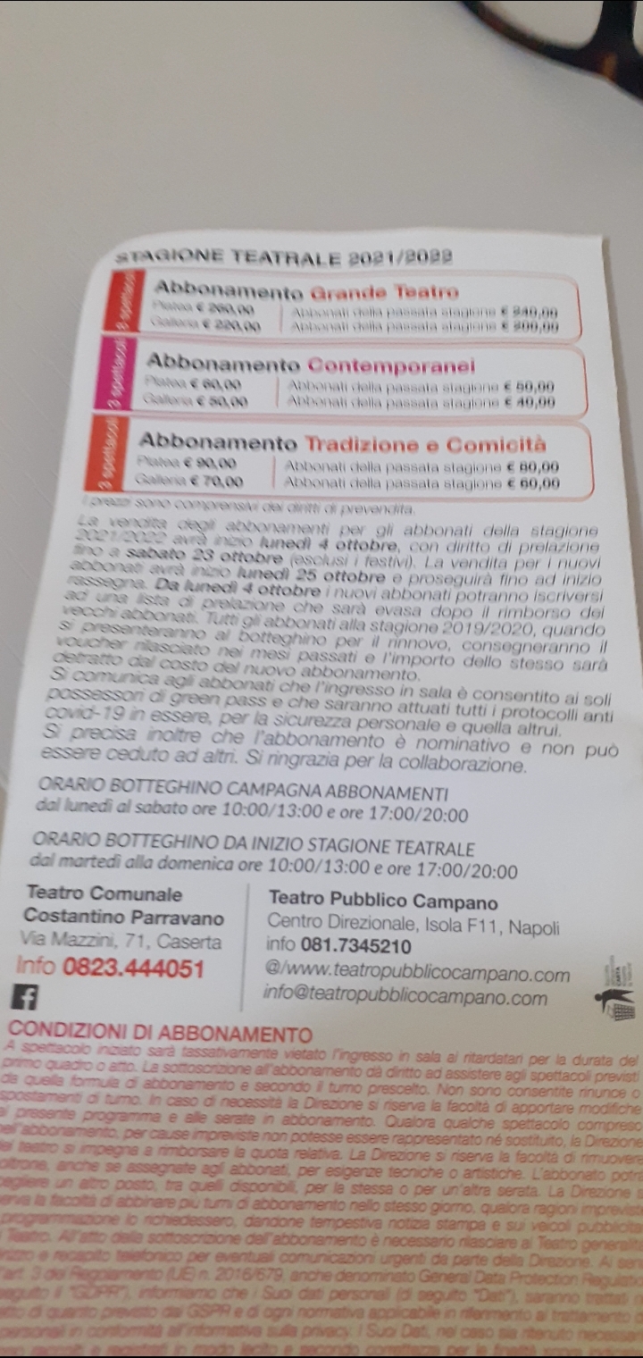 Orari botteghino da inizio stagione teatrale, da martedì a domenica ore 10.00 – 13.00 e 17:00 20.00. Per tutte le info è possibile recarsi in sede al Teatro Costantino Parravano, via Mazzini n. 71, Caserta, info telefoniche è possibile richiederle al n. 0823/444051.
