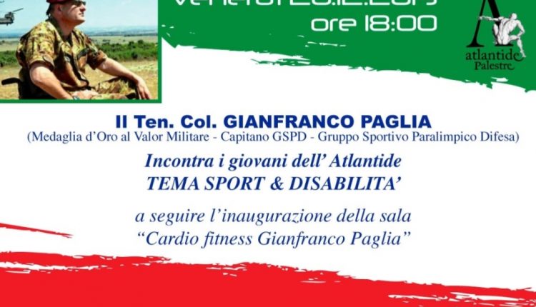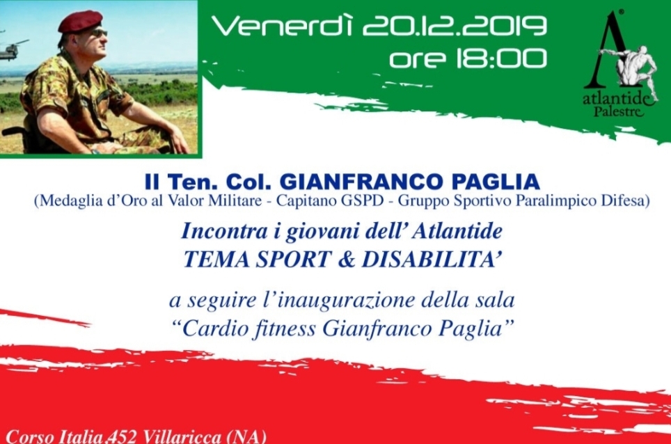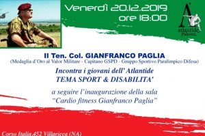 VILLLARICCA (NA) – “Sport e disabilità” sarà questo il tema della conferenza che il Ten. Col. Gianfranco Paglia terrà venerdì, 20 dicembre 2019, con inizio alle ore 18:00 presso la palestra Atlantide di Villaricca.