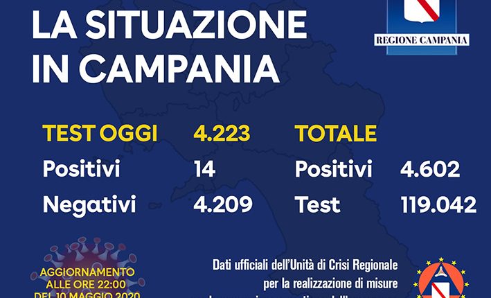 CASERTA – In Campania i positivi al Covid-19 sono 4.602, con altri 14 casi riscontrati su 4.223 tamponi (119.042 dall’inizio della pandemia). L’Unità di Crisi della Regione Campania ha comunicato i dati relativi ai tamponi esaminati: