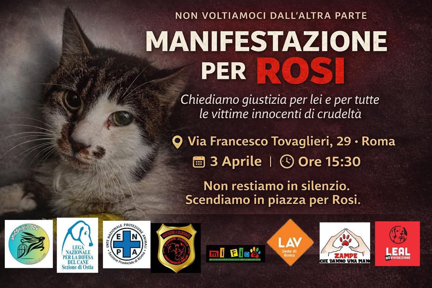 Gli organizzatori hanno dichiarato, come riporta Italia Life 24, “Rosi è una gattina vittima di una violenza atroce, un episodio che ha scosso profondamente tutti noi e che non può e non deve restare senza risposta. Scendiamo in piazza per lei, per chiedere giustizia e per dare voce a tutte le vittime innocenti di crudeltà. Non possiamo più tollerare il silenzio, l’indifferenza e l’omertà di fronte a fatti così gravi. Questa manifestazione vuole essere un momento di unione, di responsabilità e di impegno civile, affinché episodi come questo non accadano mai più e affinché i responsabili vengano individuati e puniti. Invitiamo cittadini, associazioni, volontari e chiunque abbia a cuore il rispetto e la tutela degli animali a partecipare”.