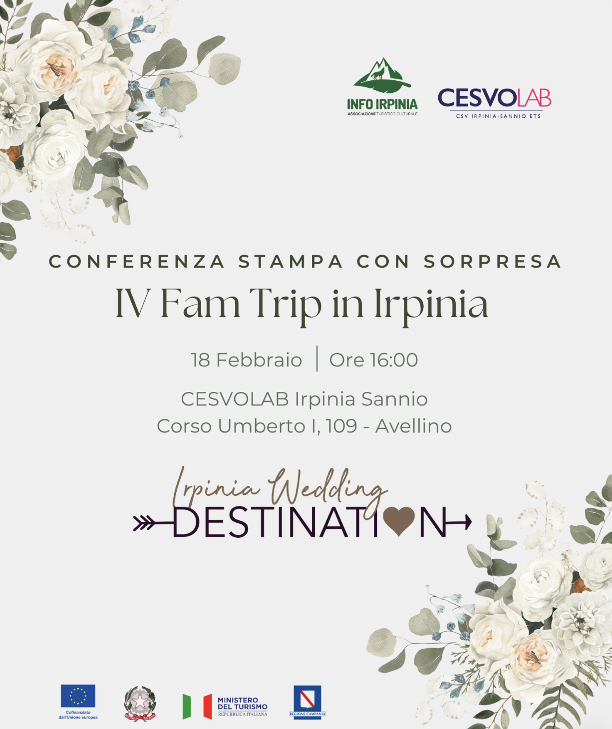 Mercoledì 18 febbraio alle ore 16:00, presso il CESVOLAB Irpinia Sannio di Avellino (Corso Umberto I, 109), si terrà la conferenza stampa di presentazione della IV Fam Trip in Irpinia, organizzata da Info Irpinia in collaborazione con la wedding planner Vittoria Belmonte.