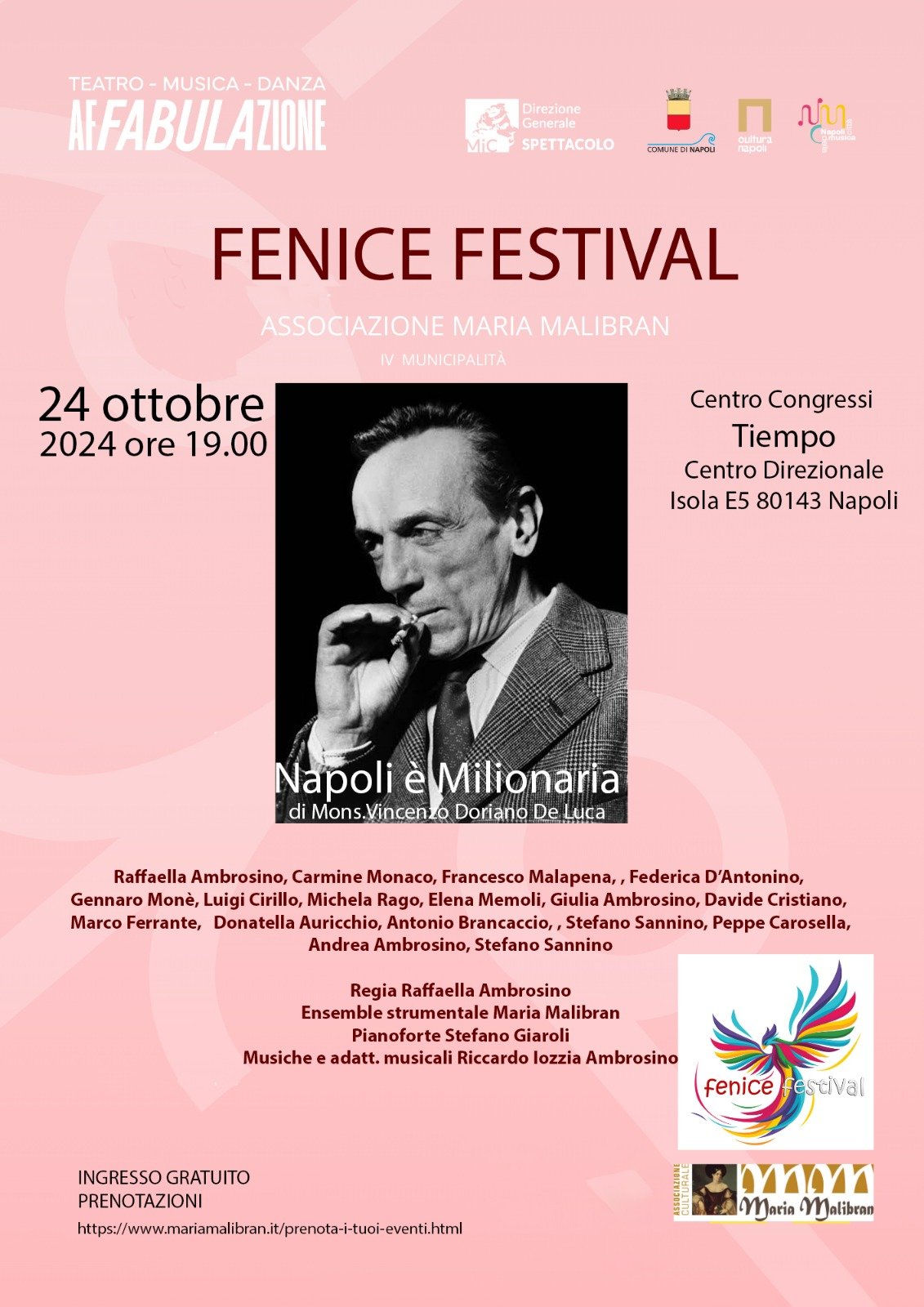 Da giovani rivelazioni della musica italiana come A|M al soprano Raffaella Ambrosino, dall’opera in lirica “Napoli è Milionaria” liberamente ispirata alla commedia di Eduardo De Filippo, rappresentata con l’orchestra Maria Malibran, al David di Donatello Angelo Orlando. Prosegue con un evento imperdibile la prima edizione di “Fenice Festival”, la rassegna di spettacoli e concerti a ingresso gratuito realizzata dall’associazione Maria Malibran, nell’ambito di “Affabulazione. Espressioni della Napoli policentrica”, il progetto promosso e organizzato dal Comune di Napoli e finanziato dal Fondo Nazionale per lo Spettacolo della Direzione Generale Spettacolo del Ministero della Cultura.