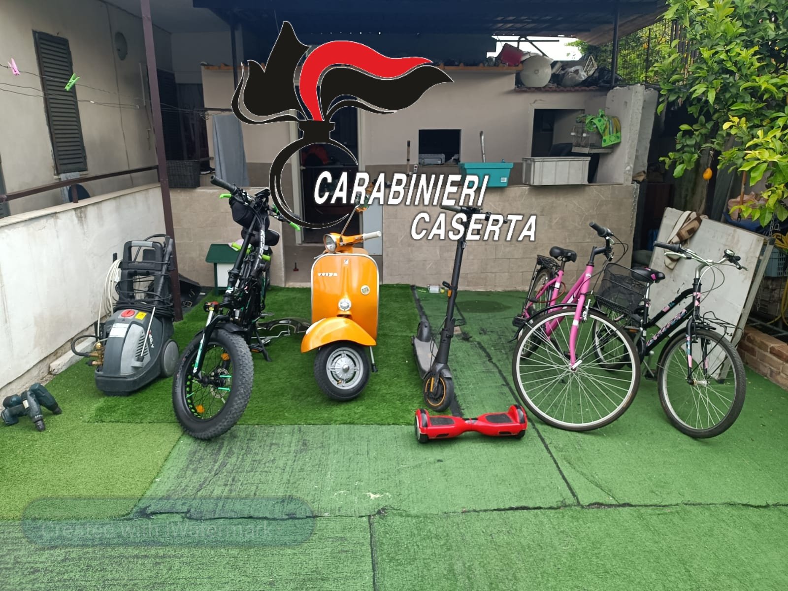 Presso l’abitazione dei due arrestati, anch’essa perquisita, i carabinieri hanno poi rinvenuto e sequestrato un ciclomotore tipo vespa 50, una idropulitrice; un monopattino; un hoverboard e tre biciclette, di cui una elettrica, rubati nella provincia di Caserta motivo per il quale i due sono stati anche denunciati per ricettazione.
