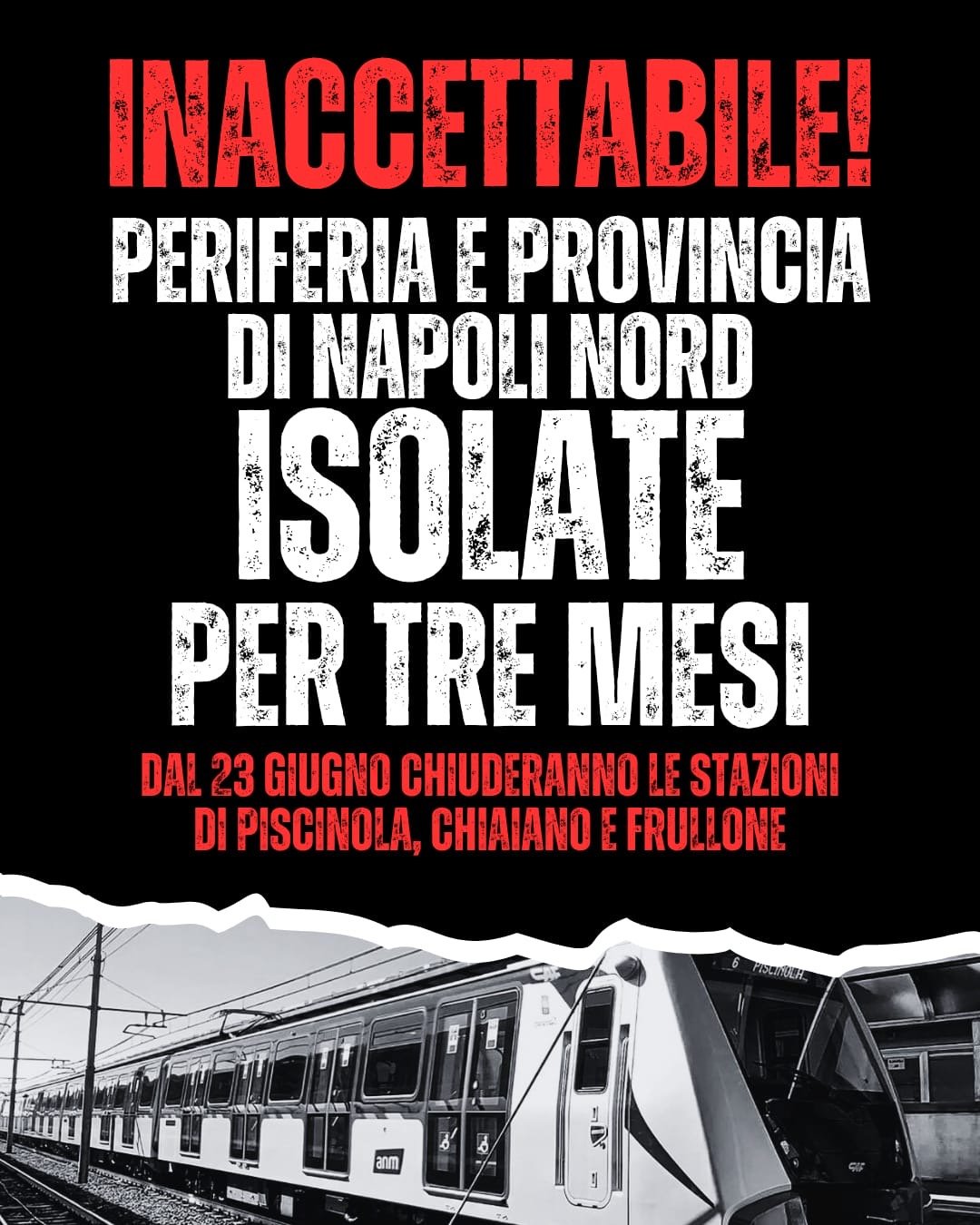 Il 6 Giugno, L’ANM ha annunciato, con colpevole ritardo, un intervento straordinario sulla Linea 1 che comporterà la chiusura delle stazioni di Piscinola-Scampia, Chiaiano e Frullone. Una comunicazione arrivata a ridosso dell’inizio dei lavori, che condanna interi territori a un isolamento inaccettabile. Ad una vera e propria ghettizzazione.