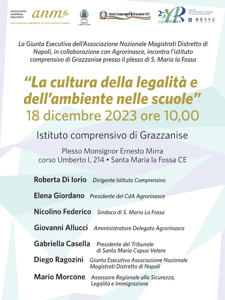 Santa Maria La Fossa (CE)- La Giunta Esecutiva dell’Associazione Nazionale Magistrati Distretto di Napoli, in collaborazione con Agrorinasce e l’Amministrazione Comunale di S. Maria La Fossa,incontra l’Istituto Comprensivo di Grazzanise presso il plesso di Santa Maria La Fossa “Monsignor Ernesto Mirra”, il 18 dicembre 2023 alle ore 10:00.