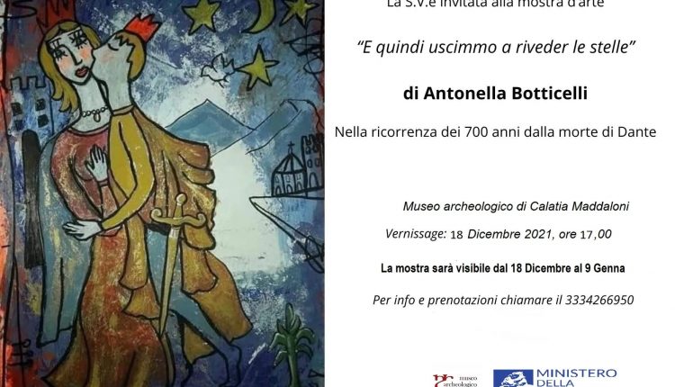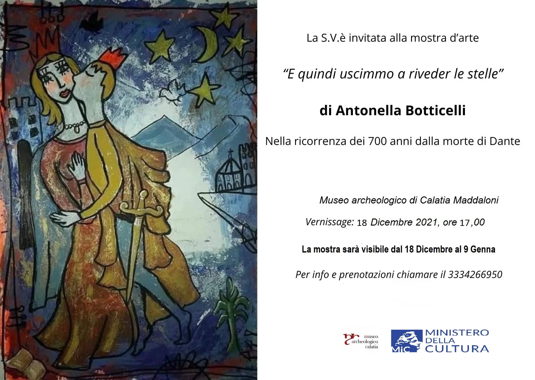 “Dante e la sua Comedìa svelati attraverso l’arte contemporanea. Un progetto non nuovo nell’ambito dei linguaggi visivi d’avanguardia, a cui già si sono accostati svariati autori sia di ambito nazionale che internazionale. Nonostante questa premessa, è opportuno, poi, ricordare che ogni artista ha saputo, reinterpretarne i temi e, soprattutto, le liriche secondo il proprio stile e la propria sensibilità culturale. Un approccio, quest’ultimo, non facile da intraprendere, poiché tradurre in pittura o attraverso qualsiasi altra forma d’arte il Sommo Poeta e la sua opera maggiore è un compito abbastanza arduo da affrontare. Ciò che è stato prodotto in letteratura durante l’età medievale, un’epoca così lontana per concetto e per distanza temporale, può effettivamente esser interpretato in immagini nuove, ma solo se si riesce a comprenderne appieno il sostanziale significato storico e poetico. Per svolgere questo tipo di operazione è indispensabile avere un proprio bagaglio formativo nel campo dell’arte e, ancor di più, è necessario avere una propria potenza creativa ed immaginifica. Sono questi i principi che hanno mosso la recente ricerca artistica di Antonella Botticelli, interamente dedicata a Dante Alighieri ed esposta alla mostra “E quindi uscimmo a riveder le Stelle”. Diciotto sono i pezzi da lei realizzati attraverso l’ausilio della tecnica mista su cartoncino. I lavori sono stati eseguiti secondo un precipuo schema narrativo della stessa Divina Commedia, ma sovvertendone l’ordine delle tematiche e dei protagonisti dei Canti. Botticelli, in merito, ha ritenuto opportuno redigere il suo personale percorso, prendendo in prestito dal testo dantesco solo alcuni episodi o personaggi: quelli che maggiormente potevano essere fonte d’ispirazione per la sua pittura.