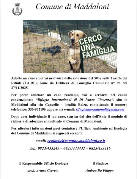 Maddaloni- Il Comune lancia un’ importante iniziativa per incentivare le adozioni dei nostri amici a quattro zampe. La Delibera del Consiglio Comunale nº 96 del 27/11/2025 ha stabilito che chiunque decida di adottare un cane dal canile convenzionato “Rifugio international di Di Nuzzo Vincenzo”, potrà usufruire della riduzione del 50% sulla TA.RI. Fondamentale l’intervento del Comune di Maddaloni per cercare di dare una famiglia e una casa a tantissimi cani.
