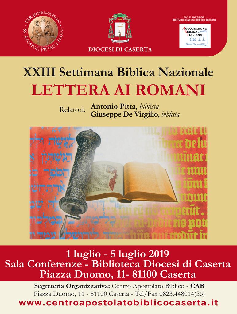 L’argomento di quest’anno si incentrerà sulla “Lettera ai Romani” di San Paolo. Infatti, proprio su questa Lettera si alterneranno i due esperti biblici per un’intera settimana da lunedì 1° luglio a venerdì 5 luglio in sessioni di lavoro che avranno inizio alle 9 di mattina e termineranno alle 18, eccezione fatta per venerdì allorché alle 13 si porrà fine alla XXIII Settimana Biblica per darsi appuntamento alla nuova già prevista per il 2020.