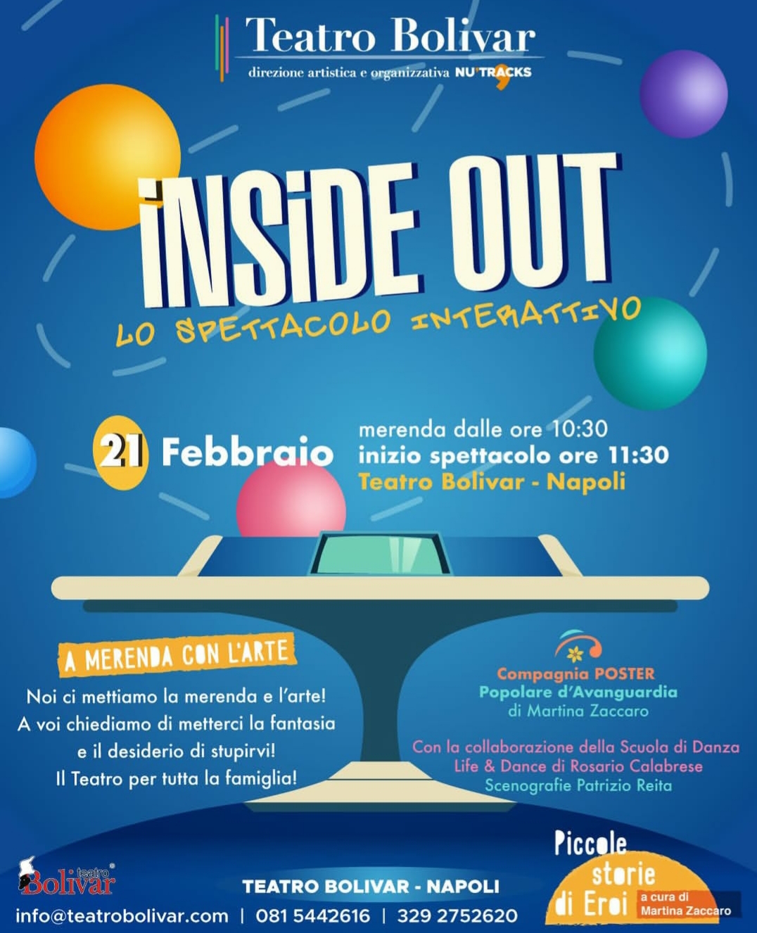 Al Teatro Bolivar, diretto da Nu’Tracks, va in scena un altro spettacolo della rassegna di successo per bambini e famiglie “A merenda con l’arte” con la Compagnia POSTER popolare d’Avanguardia a cura di Martina Zaccaro. Sabato 21 febbraio, a partire dalle ore 10.30 (merenda) con start alle ore 11.30, arriva il secondo appuntamento “Inside Out – Emozioni interattive”, tratto dal celebre film di animazione di Pete Docter, in assoluto il più rappresentativo e coinvolgente sull’educazione infantile alla sfera emotiva.
