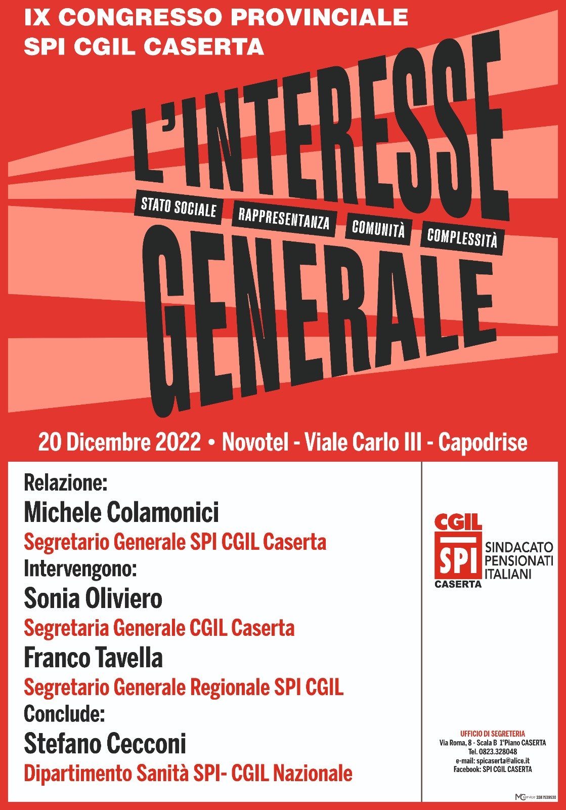 Interesse generale, è questo il titolo del IX congresso provinciale dello Spi Cgil in programma martedì 20 dicembre, a partire dalle ore 9,30 presso il Novotel di viale Carlo III. Ad aprire i lavori il segretario uscente Michele Colamonici che terrà la relazione programmatica. Parteciperanno al dibattito i vertici dell’organizzazione sia confederale che di categoria. Ai lavori interverranno infatti il segretario generale della Cgil di Caserta Sonia Oliviero, il segretario regionale dello Spi Cgil Franco Tavella e il componente del dipartimento nazionale sanità dello Spi Cgil Stefano Cecconi oltre alle delegazioni delle altre sigle sindacali e ai rappresentanti delle istituzioni. «Il congresso è sempre un importante momento di confronto – ha evidenziato il segretario uscente Colamonici – con l’appuntamento del 20 lo Spi Cgil apre in maniera forte la discussione sui temi del welfare e dei bisogni degli anziani che devono tornare protagonisti dell’agenda politica anche territoriale».