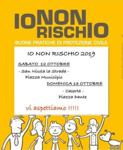 La manifestazione si svolgerà il 12 ottobre 2019 a San Nicola la Strada ed il 13 in piazza Dante a Caserta, in occasione dell’apertura della Settimana della Protezione civile: 7 giorni di eventi ed iniziative a livello nazionale e locale in cui i cittadini italiani potranno entrare a contatto con le donne e gli uomini del Servizio nazionale della protezione civile. Giunta alla sua nona edizione, “Io non rischio” vedrà la presenza di gazebo informativi in più di 850 piazze in tutta Italia con i volontari delle associazioni nazionali e locali di protezione civile che racconteranno nel dettaglio i rischi terremoto, alluvione, maremoto e – novità dell’edizione 2019 – anche il rischio vulcanico in occasione dell’esercitazione nazionale Exe Flegrei 2019.