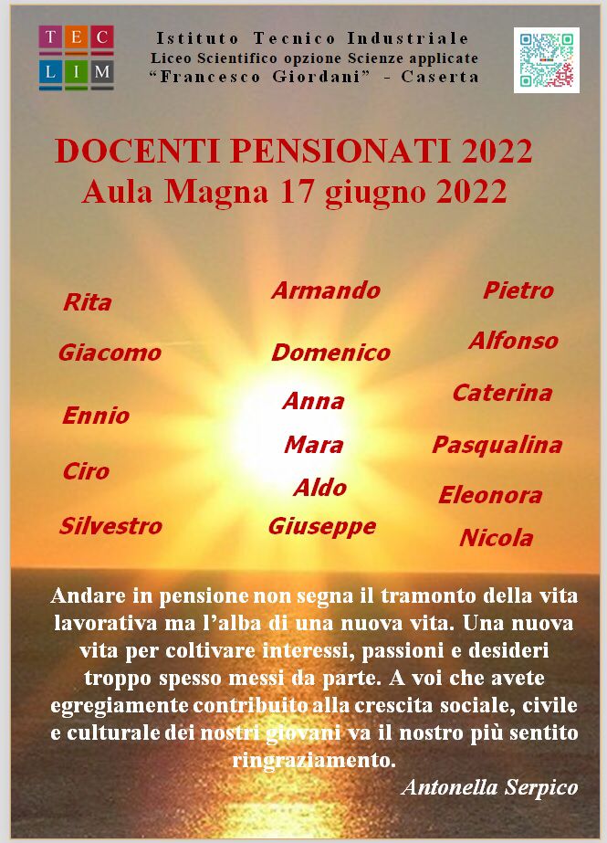 Nella mattinata di oggi , venerdì 17 giugno , il collegio dei docenti del Giordani, il prestigioso istituto tecnologico di Caserta, diretto dalla preside Antonella Serpico saluta i docenti che andranno in pensione dal 1 settembre 2022.