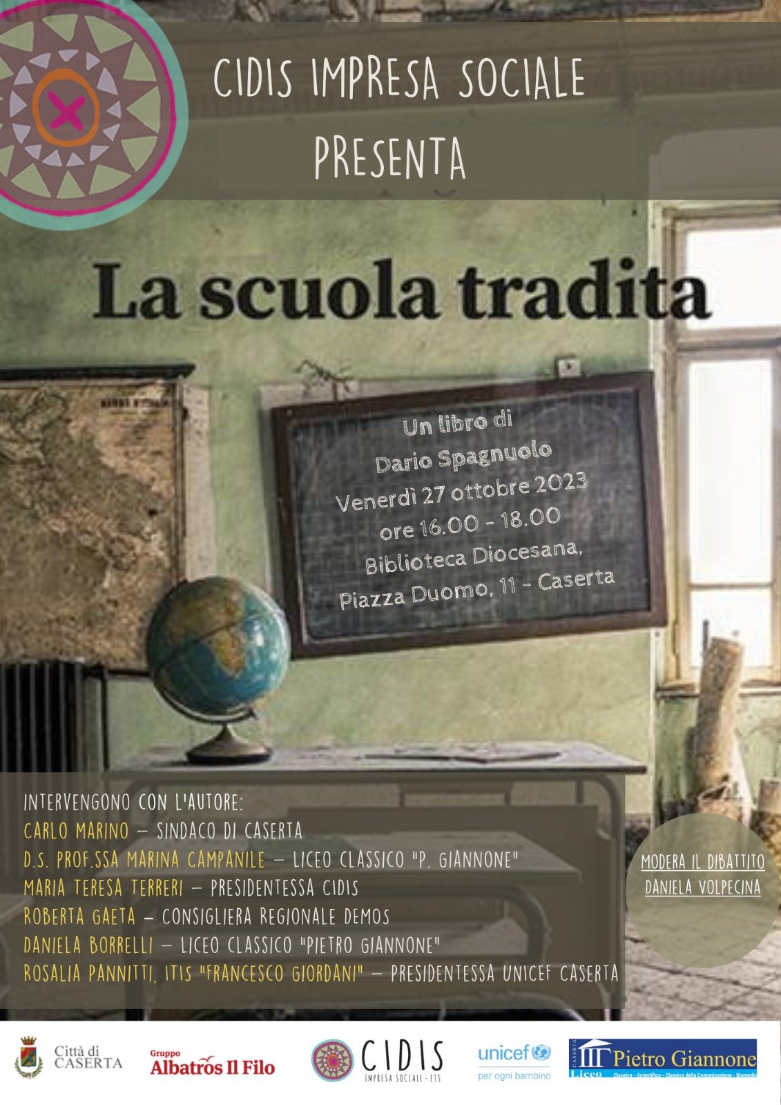 ‘La scuola tradita’, questo il titolo del nuovo libro di Dario Spagnuolo che sarà presentato venerdì 27 ottobre alle ore 16 nei locali della Biblioteca diocesana di Caserta. L’incontro rientra nel ciclo degli eventi culturali organizzati sul territorio da Cidis Impresa sociale per promuovere il confronto e la partecipazione attiva dei cittadini su temi di grande attualità. In apertura i saluti di un rappresentante dell’Amministrazione comunale, della dirigente scolastica del liceo classico ‘Giannone’, Marina Campanile, e della sociologa Irma Halili, responsabile del settore cultura del Cidis. Dialogheranno con l’autore, la consigliera regionale Roberta Gaeta, la professoressa del liceo ‘Giannone’, Daniela Borrelli, la presidente dell’Unicef e professoressa dell’Itis – liceo scientifico ‘Giordani’, Rosalia Pannitti e la presidente del Cidis, Maria Teresa Terreri. Sotto i riflettori il mondo della scuola con le sue questioni educative, il bisogno di concretezza degli studenti, le aspettative dei genitori. Con lo sguardo del dirigente scolastico, Dario Spagnuolo ci offre una bussola per accompagnarci nel mondo dell’istruzione italiana evidenziando peraltro la necessità che la scuola sia tutelata dalle continue incursioni di campo di chi, in fin dei conti, in questa istituzione vede solo un’occasione di successo, di vantaggio o di guadagno. ‘Se la scuola – sostiene l’autore – è il regalo più grande che la Costituzione italiana ha fatto ai più giovani, allora le pressioni a cui è sottoposta, il modo in cui è vista ed è trattata, sono espressione di come il Paese guarda alle generazioni più giovani’.