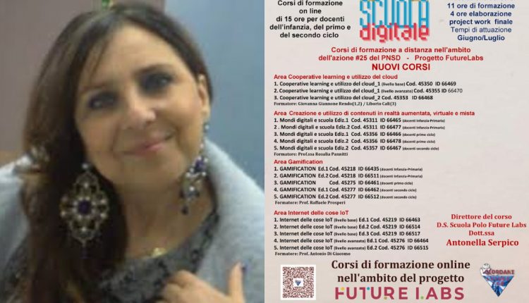 Si tratta di Corsi di Formazione on line per Docenti dell’Infanzia, del Primo e del Secondo Ciclo.Questa l’articolazione dei Corsi: 11 ore di formazione e 4 ore di elaborazione con project work finale nel periodo compreso fra giugno e luglio 2020. Il Direttore del Corso e’ la Dott.ssa Antonella Serpico Dirigente Scolastico della Scuola Polo Future Labs.