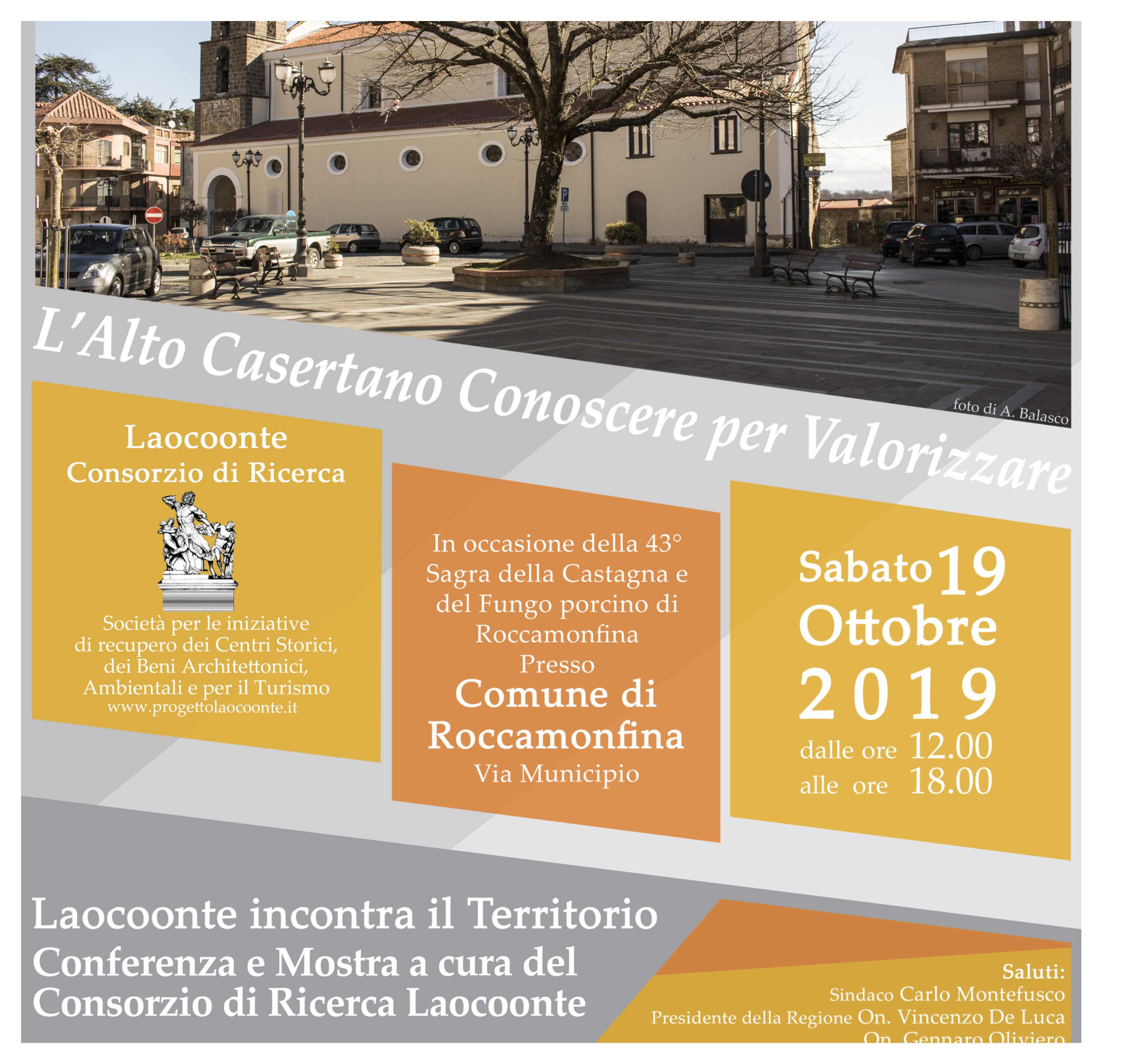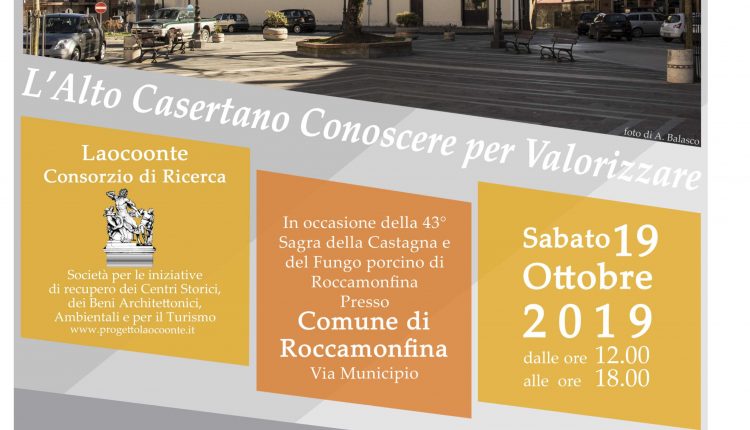 Sabato 19 ottobre, presso la sede del Comune di Roccamonfina, il Consorzio di ricerca “Laocoonte” presenterà l’attività che da alcuni anni svolge sul territorio dell’Alto Casertano per il recupero e la valorizzazione dei Centri Storici con la mostra: “L’Alto Casertano, conoscere per valorizzare. Laocoonte incontra il territorio” a cura del direttore del Consorzio Mariano Nuzzo coadiuvato dal gruppo di ricerca composto da Marianna Aurilio, Alfredo Balasco, Vincenzo Basilicata, Serena Caldarelli, Claudia di Benedetto, Ilaria Pontillo e Irene Savinelli.