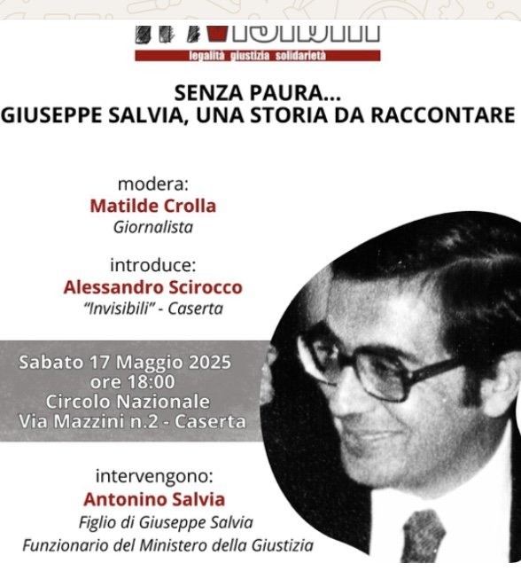 Un’iniziativa per raccontare la vicenda che ha portato all’omicidio di Giuseppe Salvia, tenerne viva la memoria e ricordarne il valore è stata organizzata a Caserta dall’associazione di legalità “Invisibili”. Il convegno dal titolo: “Senza paura… Giuseppe Salvia, una storia da raccontare” si terrà, infatti, Sabato 17 Maggio 2025 alle ore 18:00 presso il Circolo Nazionale di Caserta in via Mazzini n.2. L’incontro, moderato dalla giornalista Matilde Crolla ed introdotto da Alessandro Scirocco componente casertano dell’associazione, vedrà gli interventi di Antonino Salvia, figlio di Giuseppe Salvia e funzionario del Ministero della Giustizia, del Questore di Caserta Andrea Grassi e del Vicepresidente nazionale di “Invisibili” Enrico Trapassi. Una serata, insomma, da non perdere dove si potrà ascoltare la testimonianza e i ricordi personali del figlio e riflettere sul valore e l’impegno di un uomo dello Stato assassinato dalla camorra.G