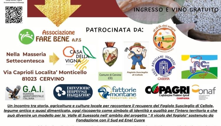 Sabato 26 luglio 2025, a partire dalle ore 18:00, la suggestiva cornice della Casa della Vigna a Cervino (CE) accoglierà la 1ª Sagra del Fagiolo, un evento promosso dall’Associazione Fare Bene APS in collaborazione con il progetto “Il Vicolo dei Fagioli”. La manifestazione rappresenta un momento di incontro tra storia, agricoltura e cultura locale, volto a raccontare il recupero del Fagiolo Suscieglio di Cellole, un legume antico e quasi scomparso, oggi riscoperto come simbolo di identità territoriale e qualità agroalimentare. Un’esperienza virtuosa che si propone come best practice per il rilancio delle tradizioni agro-sociali nella Valle di Suessola e per la valorizzazione della coltivazione dei legumi nei territori di Arienzo, Cervino, San Felice a Cancello e Santa Maria a Vico. I lavori si apriranno con i saluti istituzionali di Giuseppe Vinciguerra, Sindaco di Cervino e Giuseppe Piscitelli, Presidente dell’Associazione “Fare Bene APS” e Casa della Vigna. Seguiranno gli interventi di Elio De Rosa, agronomo; Pietro Razzino, agronomo e referente del progetto “Il Vicolo del Fagiolo”, in rappresentanza del Comune di Cellole; Gennaro Scognamiglio, dell’UNCI Agroalimentare; Andrea Striano, Responsabile “Imprese e Mondi Produttivi” di FdI; Antonio D’Acunto, Presidente nazionale della Guardia Agroforestale Italiana e di Vincenzo Santangelo, Consigliere Regionale della Campania, moderati dal giornalista e direttore Domenico Letizia.