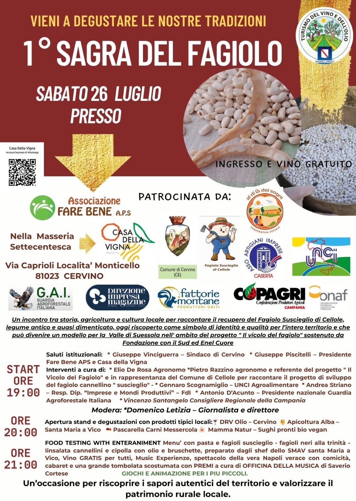 Durante la serata saranno presentati tre piatti tipici a base di fagiolo, per raccontare attraverso il gusto la ricchezza della nostra tradizione contadina. L’iniziativa proseguirà con ulteriori degustazioni di prodotti tipici locali e laboratori esperienziali dedicati al mondo del food, a cura di eccellenze del territorio e non solo: DRV Olio di Vincenzo De Rosa, Apicoltura Alba di Santa Maria a Vico, Pascarella Carni, Mamma Natur, brand Made in Italy nato a Berlino specializzato in sughi pronti biologici e vegan, e si concluderà con dell’intrattenimento musicale e attività di gioco per i più piccoli. Un’occasione imperdibile per riscoprire i sapori autentici della tradizione e valorizzare il patrimonio rurale locale.