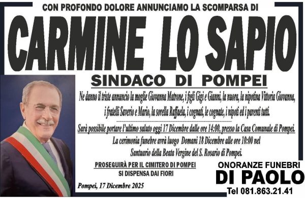 La camera ardente è stata allestita oggi pomeriggio nella Casa Comunale di Pompei, dove i cittadini potranno rendere omaggio al sindaco. I funerali sono fissati per domani, giovedì 18 dicembre alle ore 10:00, nel Santuario della Beata Vergine del Rosario.La notizia ha suscitato profondo cordoglio nella comunità locale e numerosi messaggi di vicinanza alla famiglia e all’amministrazione.