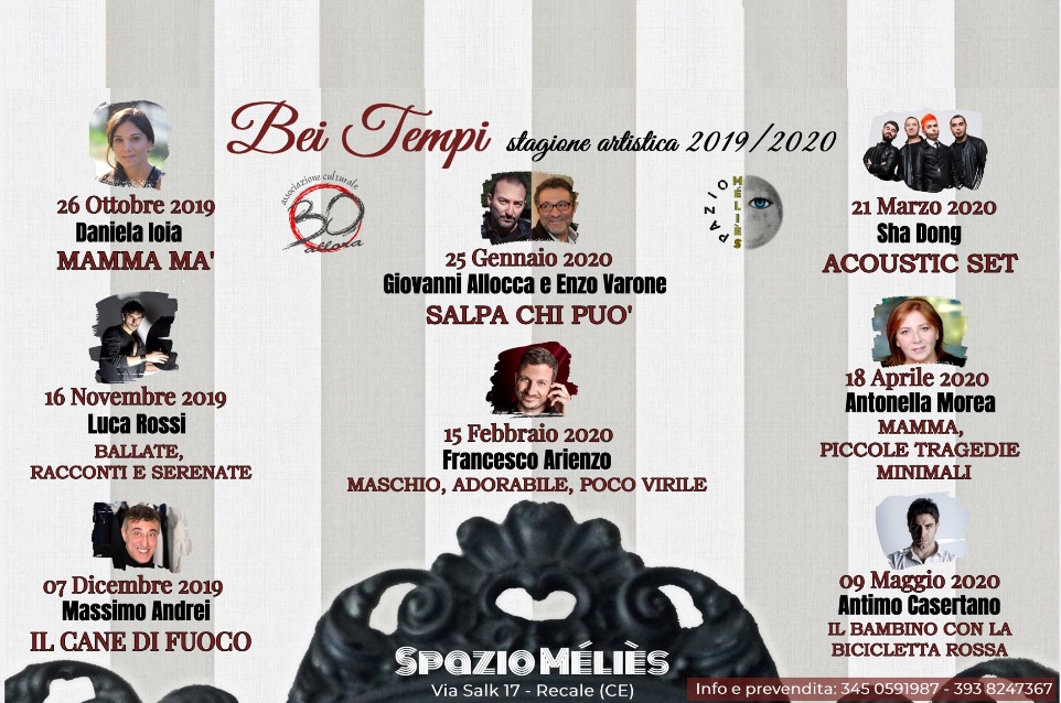 RECALE – Venerdì 27 settembre 2019, con inizio alle ore 18:30, presso lo Spazio “Melies”, sito in Recale alla Via Salk nr. 17, l’Associazione culturale “30Allora” terrà la conferenza stampa sulla nuova stagione teatrale 2019/2020. Otto bellissimi appuntamenti con degli artisti professionisti che avranno l’onore di vedere sul palco del loro piccolo teatro sotto la direzione artistica di Valeria D’AMORE, di San Nicola la Strada.