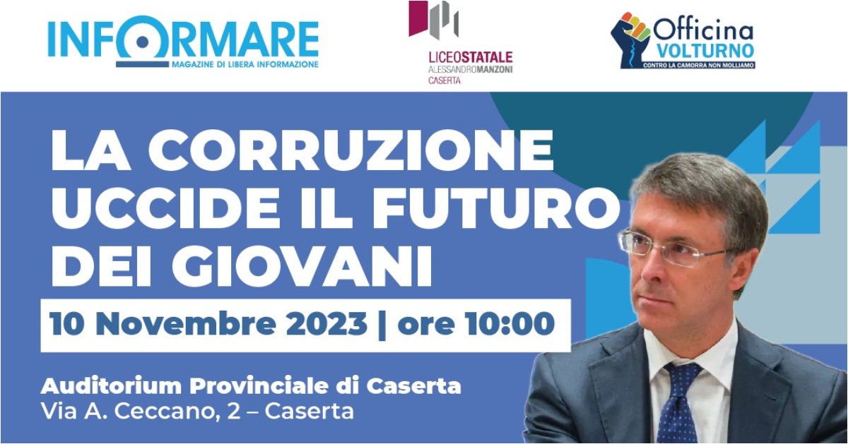 Una mattinata importante per gli alunni del Liceo Statale Alessandro Manzoni e per i cittadini di Caserta, grazie al dibattito organizzato dall’Associazione Centro Studi Officina Volturno e Magazine Informare, in collaborazione con il suddetto liceo. Il 10 Novembre alle ore 10, presso l’Auditorium Provinciale di Caserta in via Ceccano, arriva Raffaele Cantone, già Presidente dell’Autorità Nazionale Anticorruzione e attuale Procuratore Capo di Perugia.