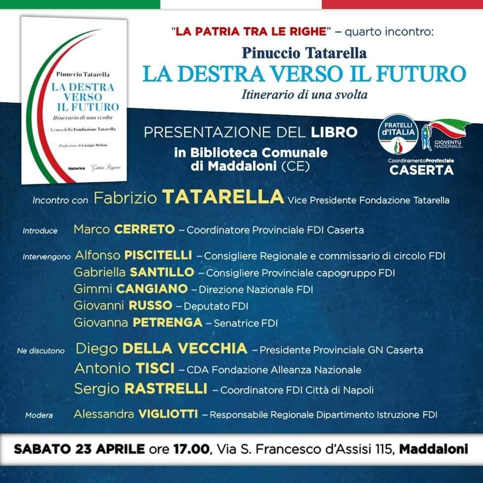 Maddaloni – Continuano senza sosta le iniziative del Gruppo Consiliare di Fratelli d’Italia di Maddaloni. Dopo il successo del Convegno sul Diritto al Lavoro e sull’emergenza sociale delle morti bianche, e dopo la Pasqua solidale in giro per la città, sabato pomeriggio è in programma un importante ed interessante convegno sul significato storico, politico e culturale della Destra Italiana attraverso le parole di Pinuccio Tatarella, raccolte in uno scritto inedito curato dal nipote, Fabrizio Tatarella e dalla Fondazione Alleanza Nazionale.