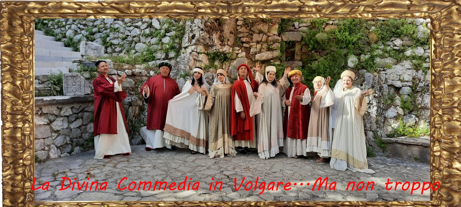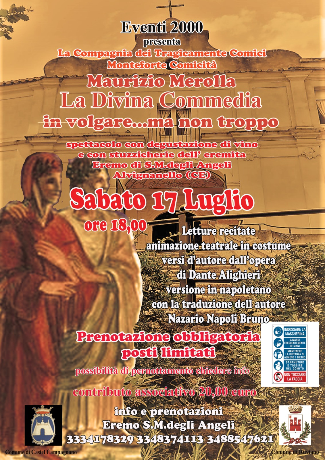Una performance di narrazione e lettura recitata dei cantipiù celebri della Divina Commedia scritti da Dante Alighieri,in occasione delle celebrazioni per i 700 anni, in una convincente prova d’attore di Merolla e degli attori della sua affiatata compagnia, in “ veri esercizi di stile linguistici, riproposti in una suggestiva e polifonica versione, tra prosa in italiano volgare e la lingua napoletana “ – uno spettacolo colto e raffinato – che rappresenta un viaggio sentimentale alla riscoperta della cultura letteraria del “Sommo Poeta”, seguendo il filo rosso dei canti dell’ inferno, del purgatorio e del paradiso riposti nel testo dantesco. Un percorso recitato, illustrato, declamato e musicato in costume, con l’arte affabulatoria del Teatro d’Autore. Una inedita e sorprendente visita teatralizzata, alla riscoperta dei “Tesori nascosti dei nostri Territori” , magnificamente incorniciata nella suggestiva cornice del prestigioso Eremo di Santa Maria degli Angeli ( sec. 1400 ) ad Alvignanello, monumentale sito religioso e potenziale attrazione