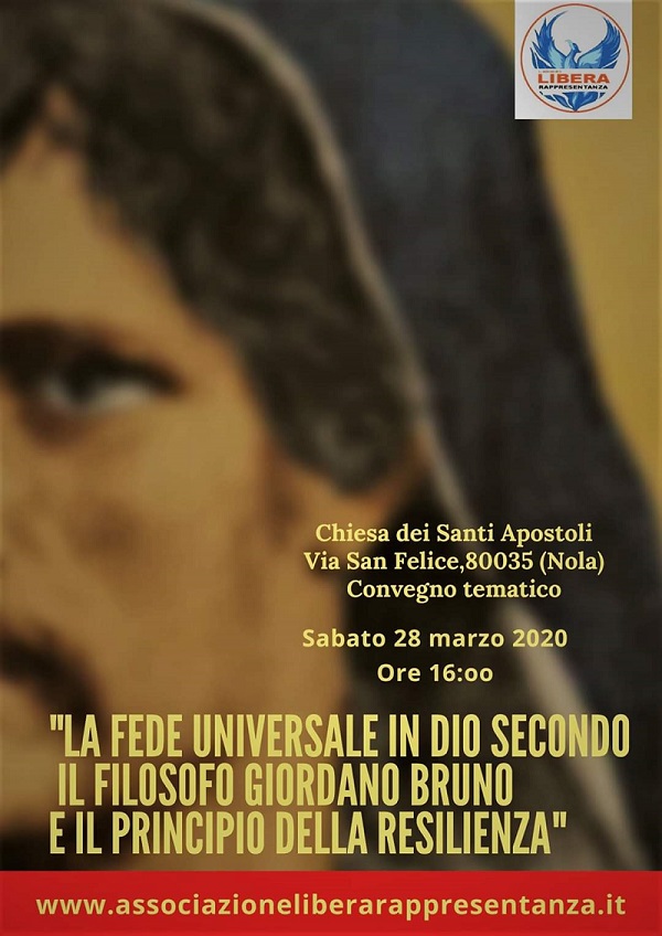 NOLA. *Sarà un convegno di spessore culturale e religioso quello che si terrà presso la “chiesa dei Santi Apostoli”, in via San Felice, a Nola, nella giornata di sabato 28 marzo, a partire dalle ore 16:00. Tema centrale: “La fede universale in Dio secondo il filosofo Giordano Bruno e il principio della Resilienza”. Ad organizzare l’evento l’associazione “Libera