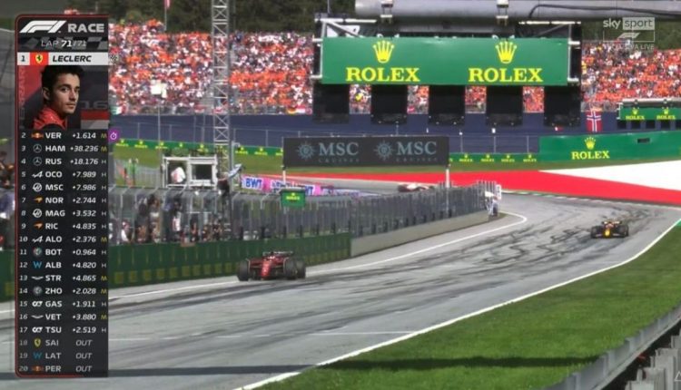 Red Bull Ring Austria. Pronti via parte il Gran Premio , davanti M. Verstappen conserva la posizione su Charles Leclerc che gli parte al fianco, dietro Russell attacca Sainz, che però risponde immediatamente, riprendendosi la posizione n. 3.