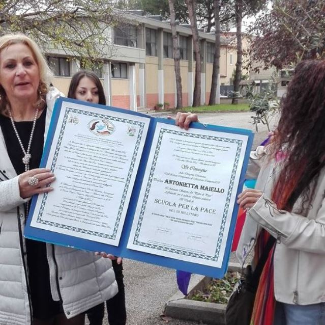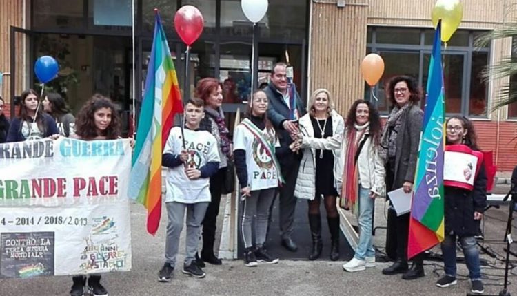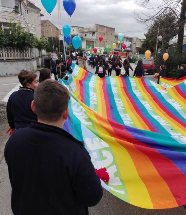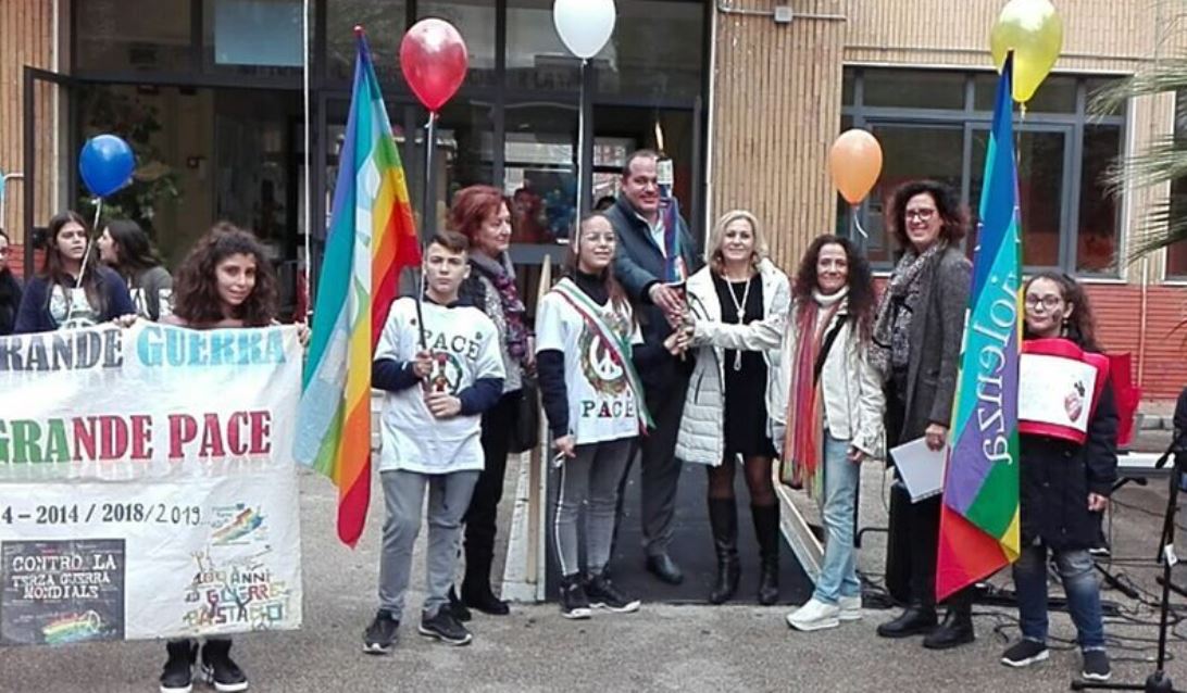 La manifestazione si è aperta con un omaggio musicale curato dall’Orchestra costituita dagli alunni della scuola, alla guida dei loro docenti di musica, quindi subito i saluti della Dirigente scolastica Maiello, che ha ricordato l’importanza di questi progetti educativi che hanno l’obiettivo di educare i giovani ai valori fondanti della Pace e della convivenza civile, a seguire quello del vice Sindaco, assessore Avv Giovanni Battista Di Matteo e della Presidente del Movimento per la Pace Agnese Ginocchio, presente con la socia del Direttivo Rosa Arbolino, che ha ringraziato la Scuola per l’adesione allo storico evento, proprio la Scuola che in questo caso indica la strada e diventa “Maestra” delle discipline della vita.