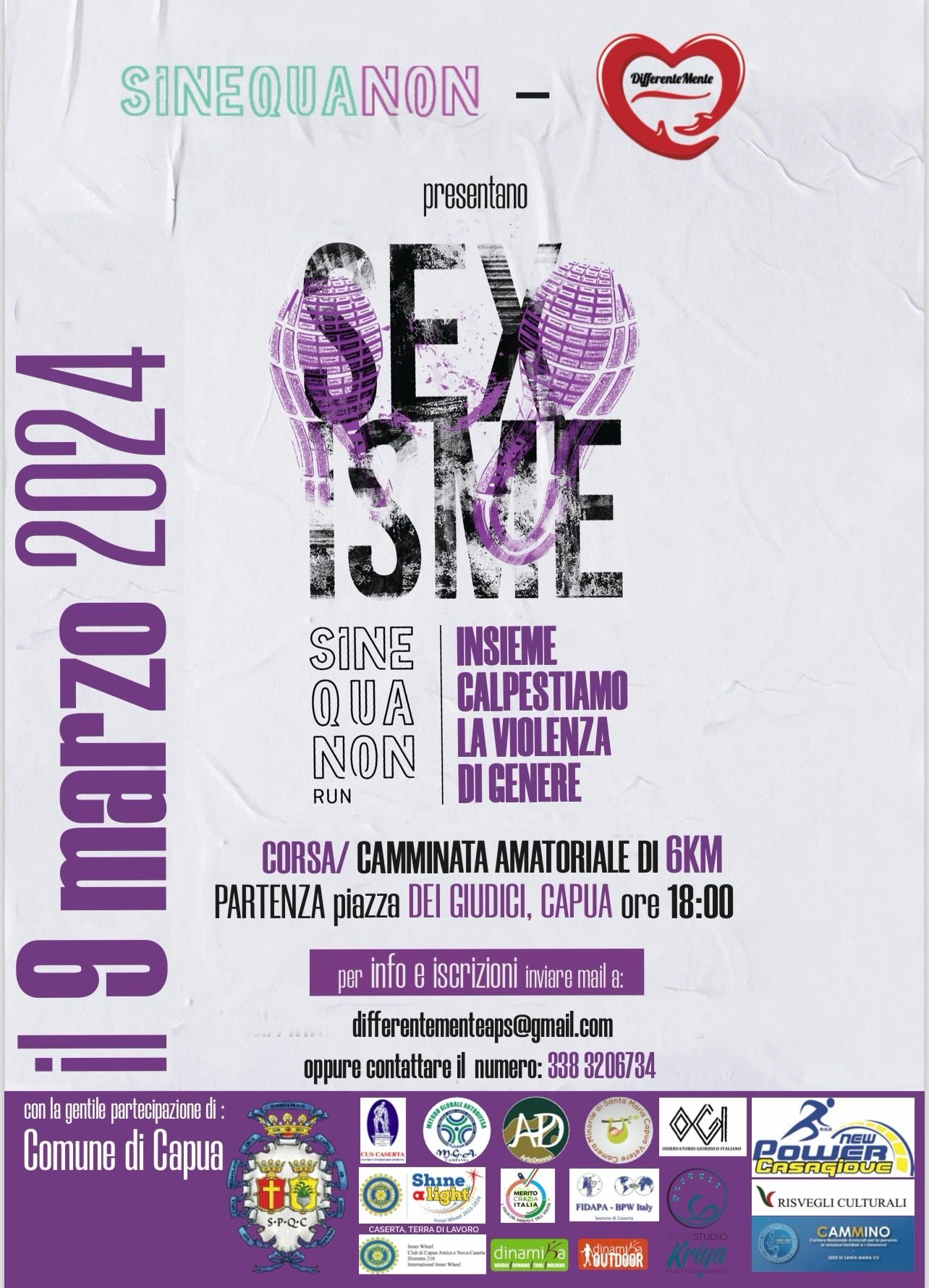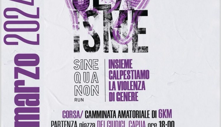 E’ anche in onore di donne come Julia che l’Associazione casertana DifferenteMente APS, che da sempre si occupa di tutela dei diritti umani, in partnership con l’associazione francese “Sine qua non”, presenta la seconda edizione italiana della corsa/ passeggiata amatoriale “Sine qua non run” per calpestare insieme la violenza sessista e sessuale. La manifestazione, Con il patrocinio del Comune di Capua e la partecipazione di: Centro Universitario Sportivo Caserta, Camera Minorile di Santa Maria Capua Vetere, Osservatorio Giuridico Italiano, Risvegli culturali, Inner Wheel Caserta Terra di Lavoro, Inner Wheel Capua Antica e Nova, MGA Campania, Arte Donna, Meritocrazia Italia, Fidapa Sez. Di Caserta, Dinamika Outdoor, New Power Casagiove, Cammino Sez. Di Santa Maria Capua Vetere e Kriya Studio, si terrà il giorno 9 marzo alle h 18 a Capua in contemporanea con quella di Parigi. Il ricavato sarà devoluto a ONU Femme, ente delle Nazioni Unite che ha lo scopo di favorire il processo di crescita e lo sviluppo della condizione delle donne e della loro partecipazione pubblica.