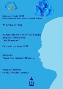 Maddaloni . Il Movimento Civico “ Cambiamo Insieme” organizza la “ Marcia in blu” in occasione della “ Giornata mondiale della Consapevolezza dell’Autismo” per Sabato 2 Aprile 2022. Il Movimento per l’occasione ha invitato tutte le scuole di ogni ordine e grado presenti in Città a partecipare alla “marcia”. Il raduno ci sarà alle ore 09.30 in viale Europa ( nell’area adiacente ed esterna all’ Istituto scolastico San Domenico) e la partenza è prevista per le ore 10.00 con arrivo in Piazza Don Salvatore D’ Angelo . La Marcia vedrà la partecipazione del Sindaco Andrea De Filippo e di altre autorità regolarmente invitate. Il Movimento Cambiamo Insieme tramite questa “passeggiata” intende sensibilizzare la cittadinanza e l’opinione pubblica su questo tema.