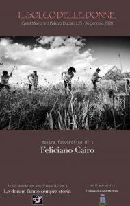 CASTEL MORRONE – Feliciano CAIRO presenta la mostra fotografica dal titolo “Il solco delle donne”. L’evento, organizzato in collaborazione con l’Associazione “Le donne fanno sempre storia”, si terrà presso il “Palazzo Ducale” di Castel Morrone nella giornata di sabato, 25 gennaio 2020, dalle ore 18:00, e domenica 26 gennaio 2020, dalle ore 9:00. La mostra si svolgerà in concomitanza con la presentazione del libro “Michelina di Cesare” della notissima giornalista e autrice Nadia VERDILE.