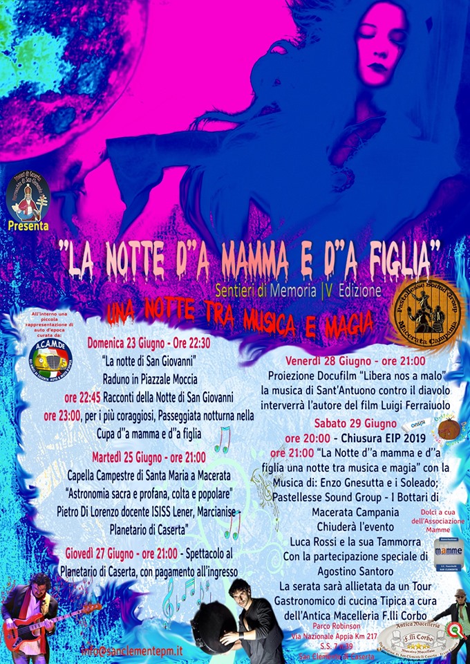 Il solstizio d’estate è un appuntamento culturale e religioso per tutti. Ma a San Clemente di Caserta si carica di un ulteriore significato simbolico ed antropologico, anche se lo stesso contenuto lo si ritrova nelle altre frazioni casertane ed in tantissime altre zone. Si tratta di un’antichissima tradizione che ciclicamente si ripete durante la notte di San Giovanni con il racconto della mamma e della figlia, che continua ad essere raccontato e, quindi, tramandato. È questo il contenuto ed il punto di partenza dell’attesissima sesta edizione dell’evento culturale.