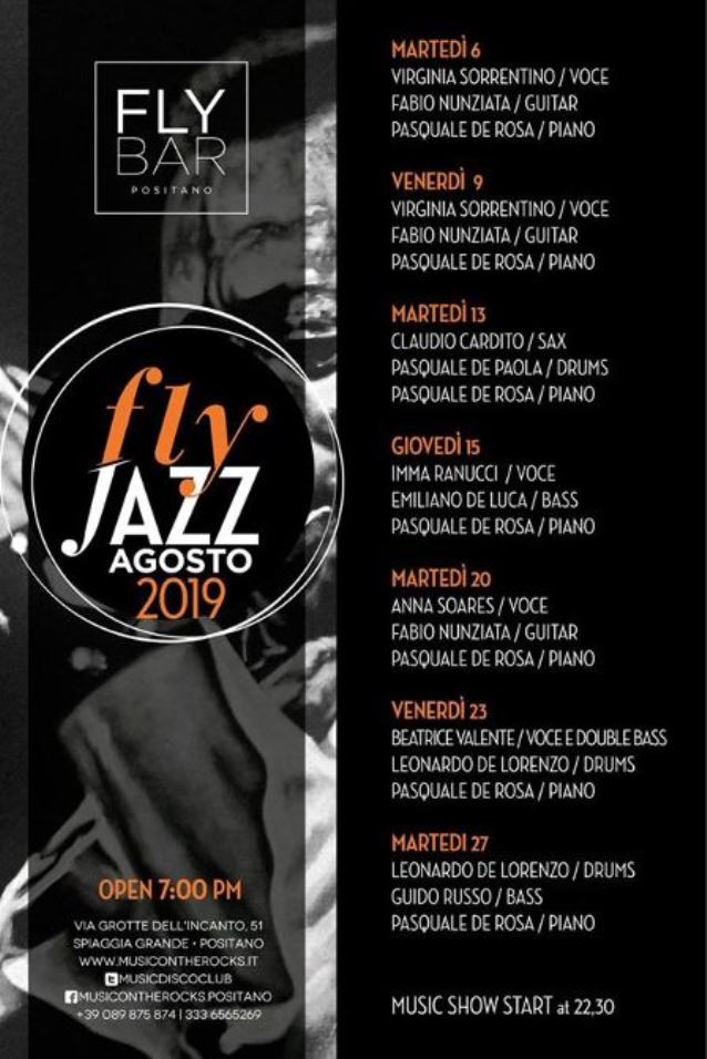 Ad agosto al FLY Lounge Bar si terrà una serie di eventi musicali jazz organizzati da Pasquale De Rosa, resident pianist e responsabile musicale sia del FLY che del RADA. Le serate si svolgeranno ogni martedì e vedranno coinvolti molti nomi noti della musica che affiancheranno Pasquale in una serie di progetti inediti ed originali.