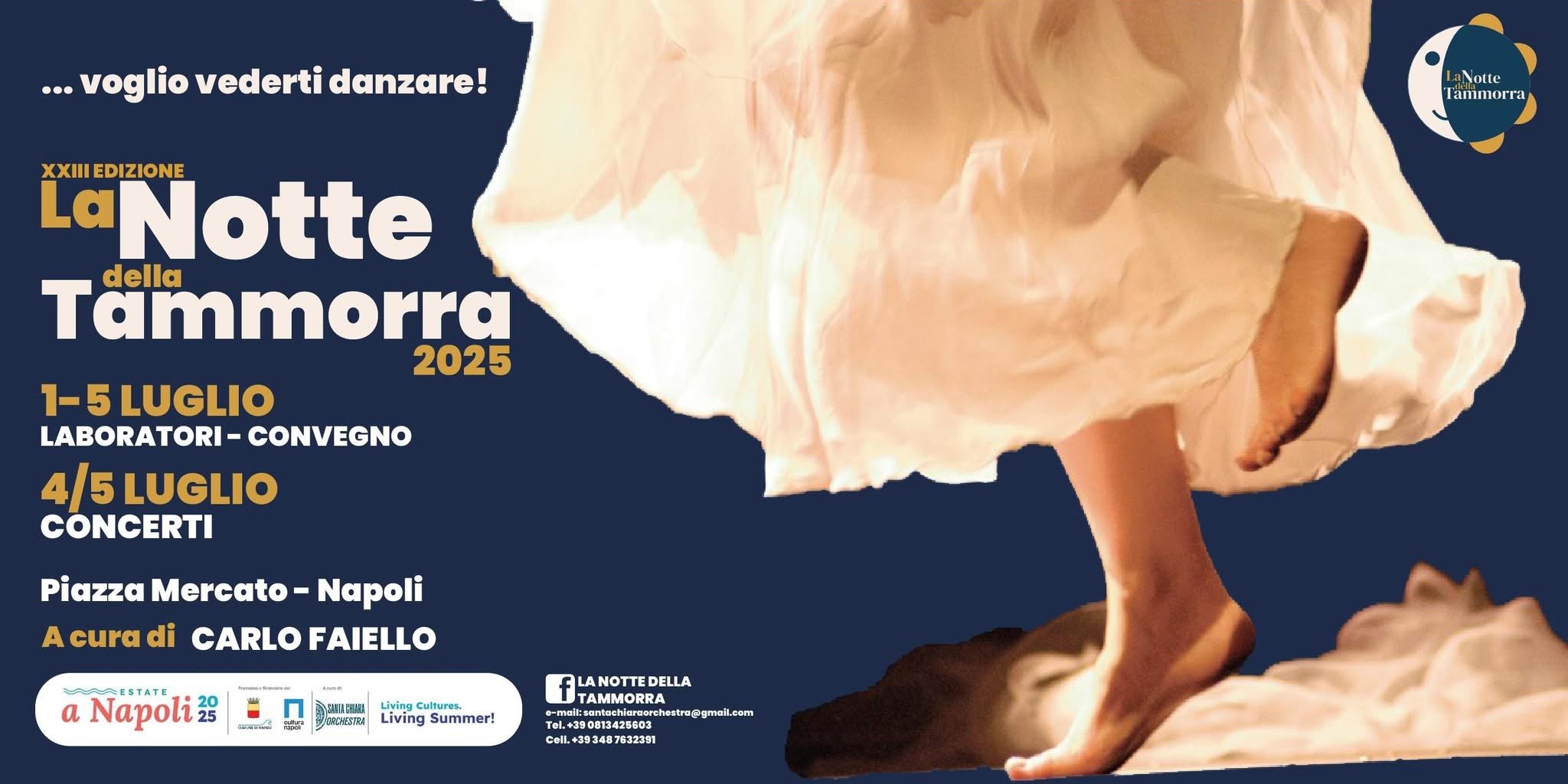 Torna ai primi di Luglio l’appuntamento più importante dell’estate partenopea con la musica folk e la festa popolare. Piazza Mercato, spazio simbolo della città, ospita dal 1 al 5 Luglio la 23esima edizione de La Notte della Tammorra, evento promosso e sostenuto dal Comune di Napoli nell’ambito di Estate a Napoli 2025, realizzato dall’Associazione Il Canto di Virgilio con Carlo Faiello maestro concertatore.