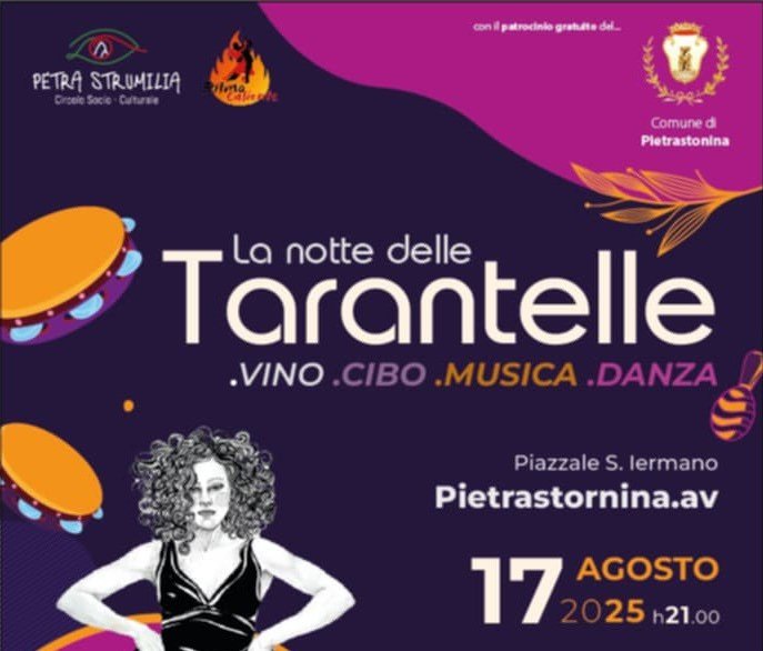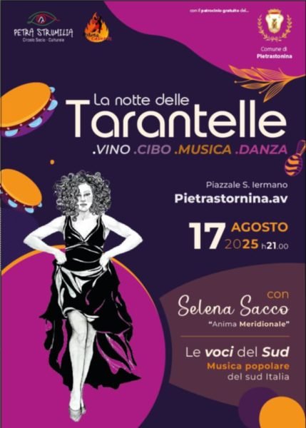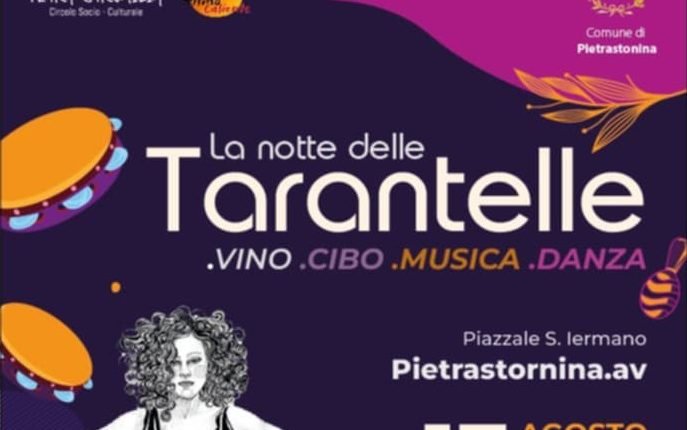 La festa della tarantella di Pietrastornina, voluta per esaltare il patrimonio artistico e culturale della musica tradizionale dell’intero SUD italico confluirà ne: “La Notte delle Tarantelle”, che dalle ore 21.00 del 17 agosto prenderà vita, nel Piazzale S. Iermano, dove i ritmi dapprima composti e lenti diverranno, via via sempre più frenetici e scateneranno la taranta che alberga nei geni dei “meridionali”. Fulcro della serata, sarà l’esibizione di Selena Sacco, interprete del progetto artistico “Anima Meridionale”, dedicato alla riscoperta e trasmissione delle danze popolari del Mezzogiorno.  L’intero evento organizzato dal Circolo Socio Culturale Petra Strumilia in collaborazione con la scuola di ballo ASD Ritmo Caliente.