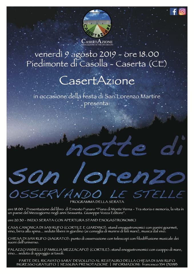 La giovane Associazione CasertAzione anche quest’anno organizza la notte di San Lorenzo in occasione della festa patronale di Casolla. Scriviamo giovane perché è fatta esclusivamente di giovani, la meglio gioventù di Casolla e dintorni e meglio perché i loro interventi spaziano in ogni campo e sempre in modo disinteressato, in un mondo che ha eletto il denaro a novello dio. Infatti, organizza una seguitissima corsa a piedi che richiama oltre cinquecento atleti da vari paesi della Campania, allestisce presentazione di libri, dà una mano alla locale chiesa per organizzare la giornata dell’ammalato e per dare un contributo di prodotti di prima necessità ed assistenza varia a persone che ne hanno bisogno ed organizza, per la terza volta, la “Notte di San Lorenzo, osservando le stelle”. Insomma, gli aderenti a quest’associazione possono veramente ben meritare il nome di meglio gioventù, come ebbe a scrivere più di sessant’anni fa il poeta e regista Pier Paolo Pasolini, che pure passò in queste zone ambientandovi diverse ed importanti scene del Decameron nel 1970.