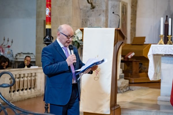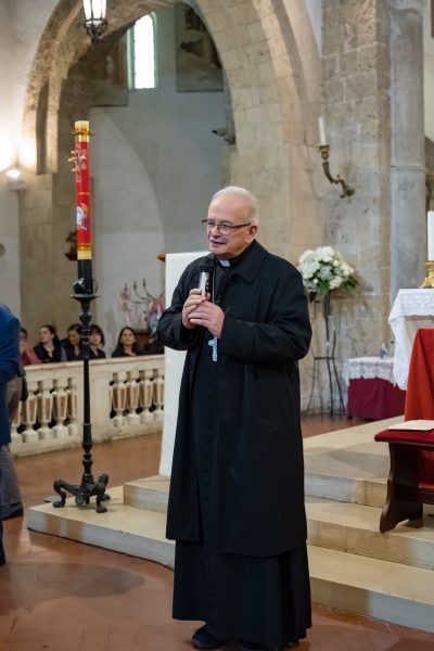 Il Parroco reggente, visibilmente commosso ed emozionato, ha rivolto il suo saluto al Vescovo, alla Giuria ringraziandoli per il lavoro svolto, ai Dirigenti scolastici e Docenti delle varie scuole di ogni ordine e grado della Diocesi di Aversa, ai genitori presenti, ha inoltre ringraziato l’organizzatore Armando Pirolli, che ha curato tutto in ogni particolare. A conclusione del suo saluto di benvenuto, ha terminato rivolgendo un messaggio ai giovani e alle giovani, citando un passaggio di Flavio Lotti (coordinatore della marcia di pace Perugia /Assisi, che si è svolta in concomitanza del Premio di Poesia), un invito ai giovani immersi nella realtà sofferente, ma anche capaci di sognare e desiderare una vita migliore. Giovani che si prendono cura della loro vita insieme a quella degli altri e del pianeta.