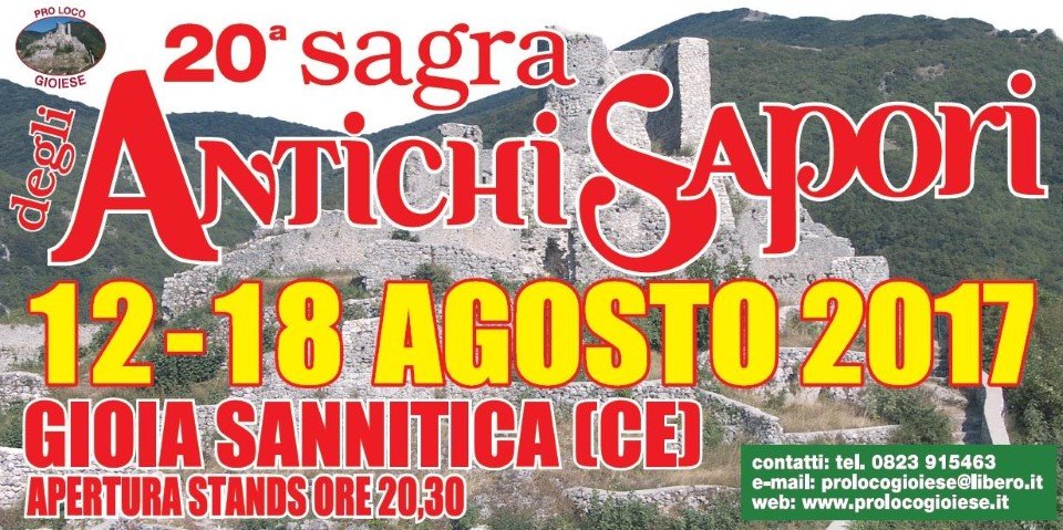 Una manifestazione quella della Sagra degli Antichi Sapori, in programma da sabato prossimo 12 e fino a venerdì 18 agosto prossimo, giunta quest’anno alla sua 20esima edizione e promossa ed organizzata come sempre dalla Pro Loco Gioiese, con il patrocinio della Provincia di Caserta, dell’Ente Parco del Matese, del Comune di Gioia Sannitica, dell’Unpli, dell’Ept di Caserta, della Comunità Montana del Matese e della Regione Campania.