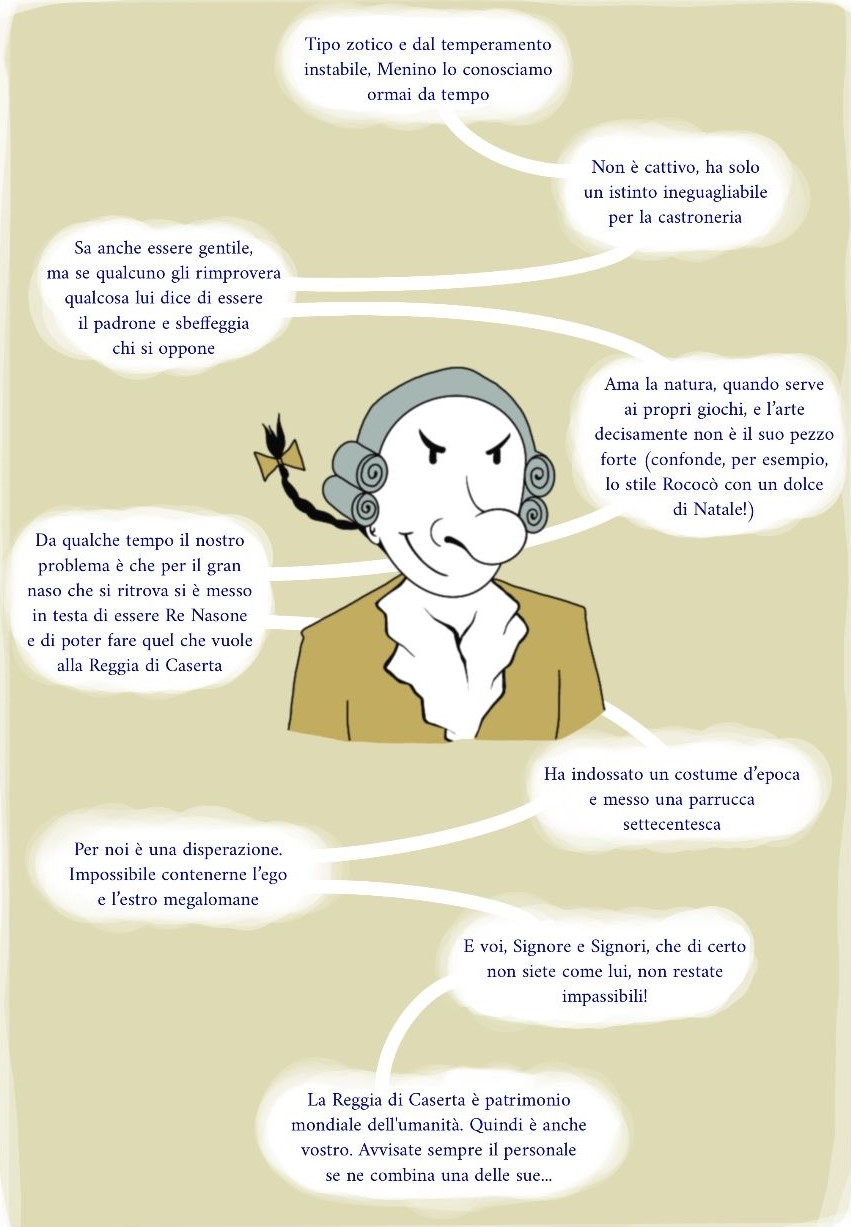 Si è inoltre scelto di illustrarlo. Dalla fantasiosa matita di Davide Racca, assistente alla vigilanza della Reggia di Caserta, è nato così “Menino”, prendendo spunto da un personaggio realmente esistito. Il guascone, irriverente e irrispettoso, è convinto di poter fare ciò che vuole all’interno del Museo. Il personaggio è il protagonista di vignette ironiche con le quali si mostra cosa non è consentito fare. Non cartelli di divieto, ma disegni colorati e scherzosi dei comportamenti non consentiti. Con un pizzico di esagerazione, per stimolare l’insofferenza collettiva a comportamenti irriguardosi.